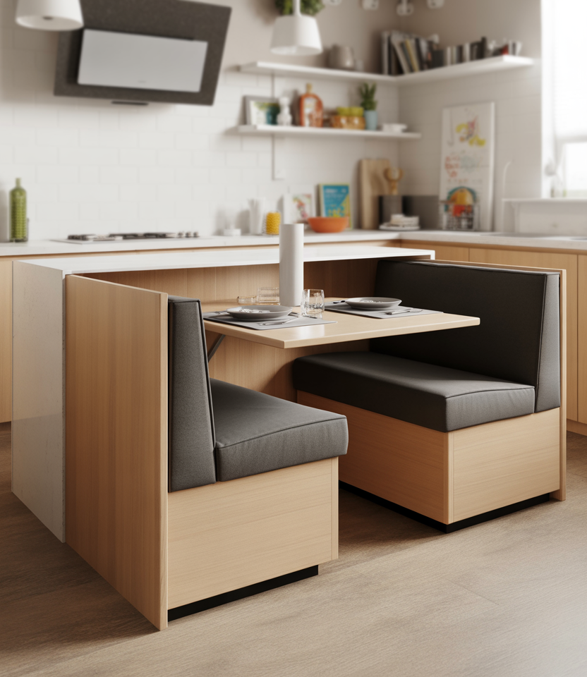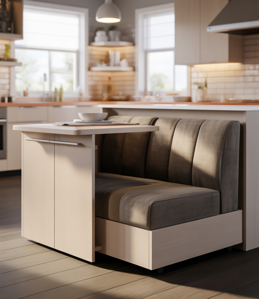 A slide-out booth tucked inside the island creates surprise seating—brilliant for tiny or small-space kitchens and fun in large homes too. Pull it out for pizza night, push it back for prep space. Pair with white oak or black cabinet finishes and plush bench cushions for comfort. I once saw a designer demo the concept in a showroom—everybody gasped like it was a movie reveal. Functional magic and a total conversation starter.