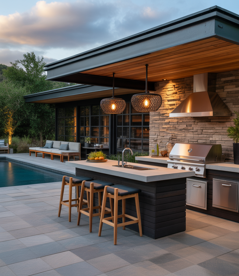 An outdoor kitchen island transforms backyard living. Choose stone bases, waterproof wood, stainless storage, and a prep sink. I grilled at a neighbor’s patio party last summer—having a full outdoor island meant no running in and out. Pair with bar stools for poolside snacks or sunset s’mores. Dark finishes like black metal weather beautifully and hide wear. Perfect for families who treat summer like a sport or anyone embracing the indoor-outdoor lifestyle sweeping modern builds across the U.S.