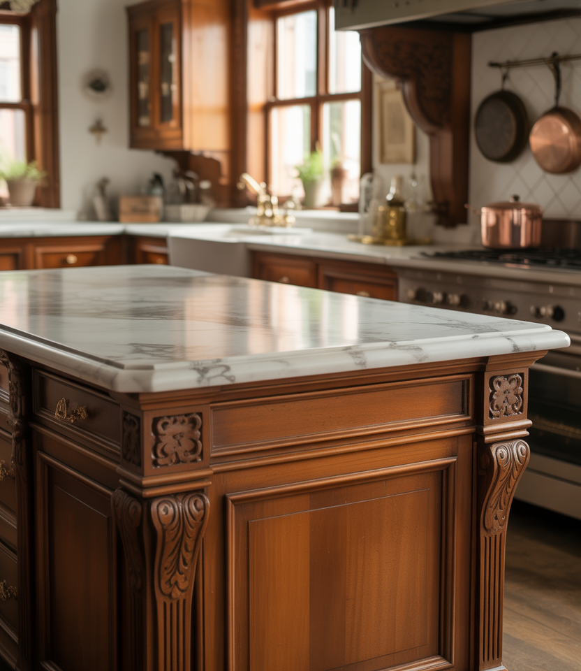 An antique or vintage-style island feels soulful—think carved legs, columns, and aged wood. It works beautifully in traditional homes or to soften stark modern lines. A friend scored an old pastry table and built a sink into it—gorgeous chaos. Keep the countertop white marble-look for contrast. Flea markets, Facebook Marketplace, and architectural salvage shops are treasure hunts for this look, letting history anchor your kitchen like a family heirloom passed down.