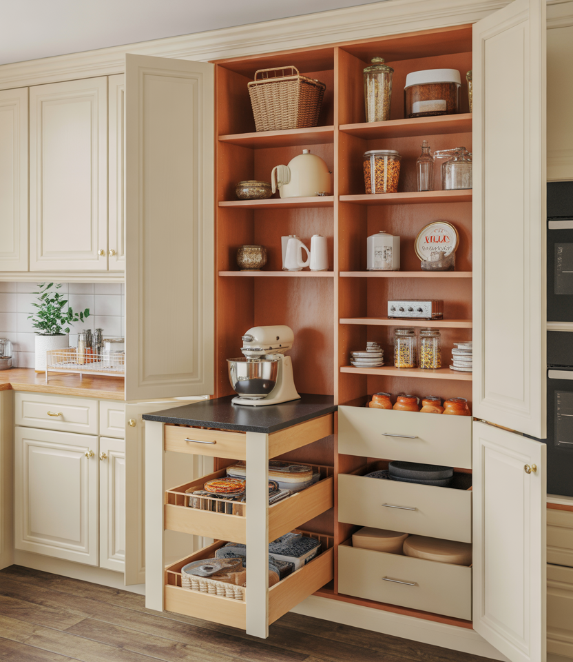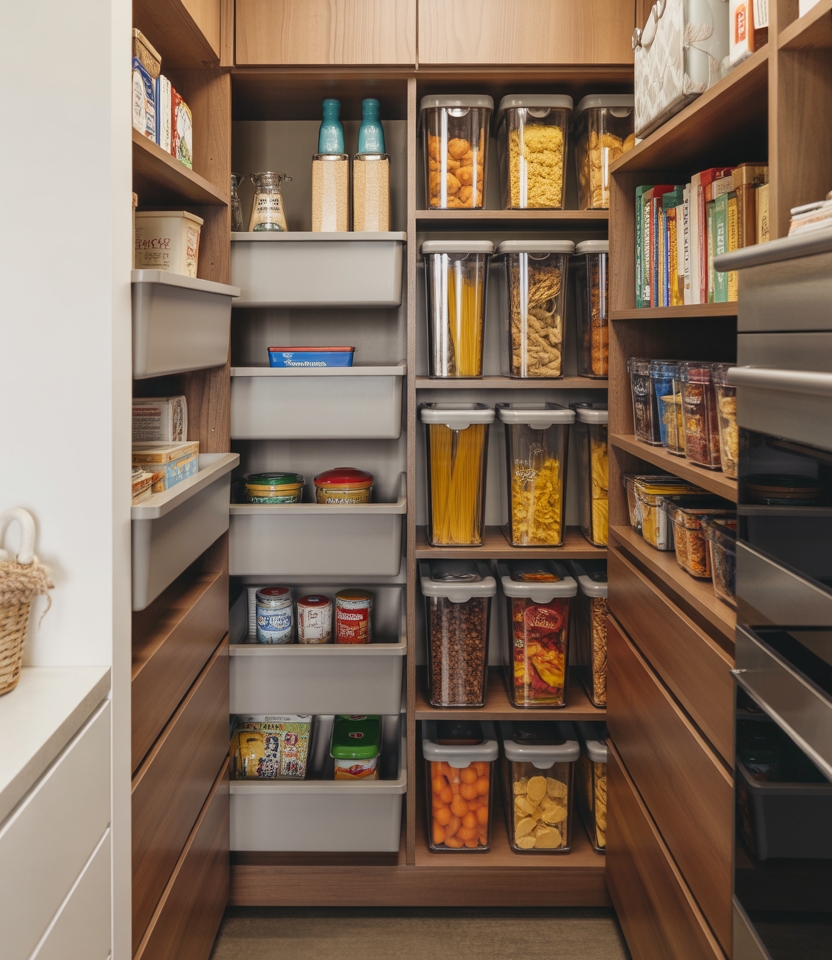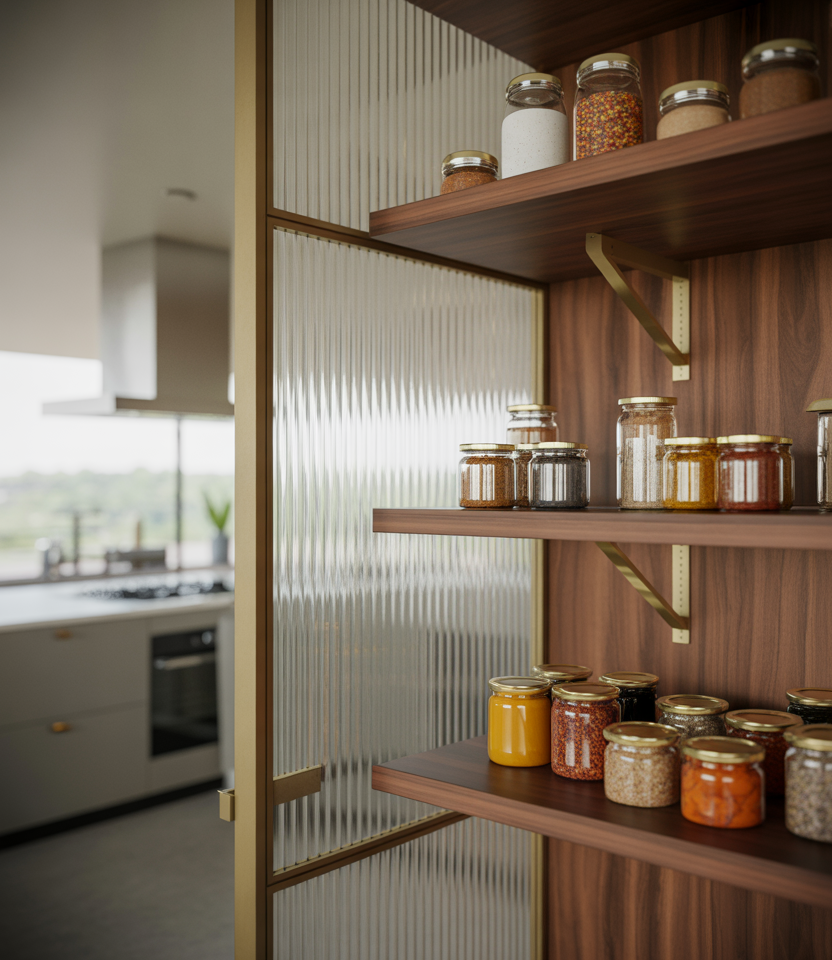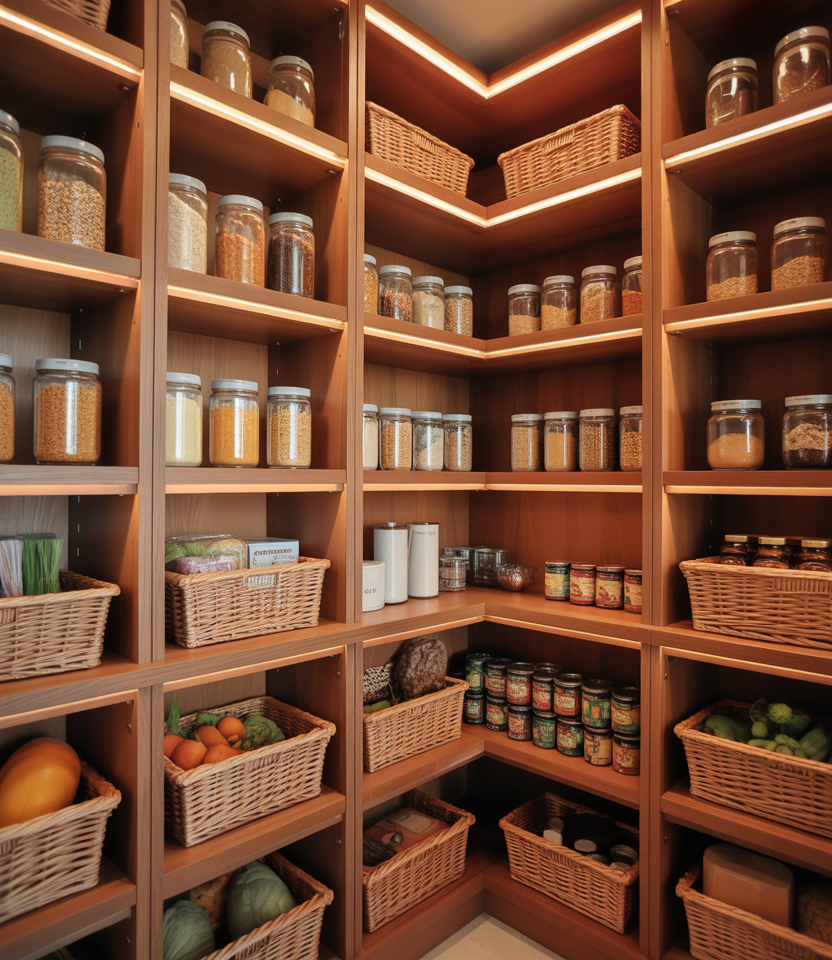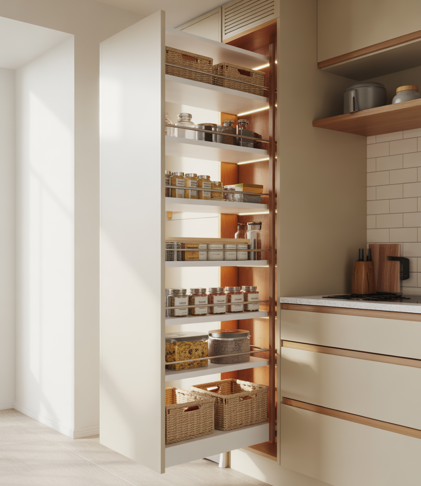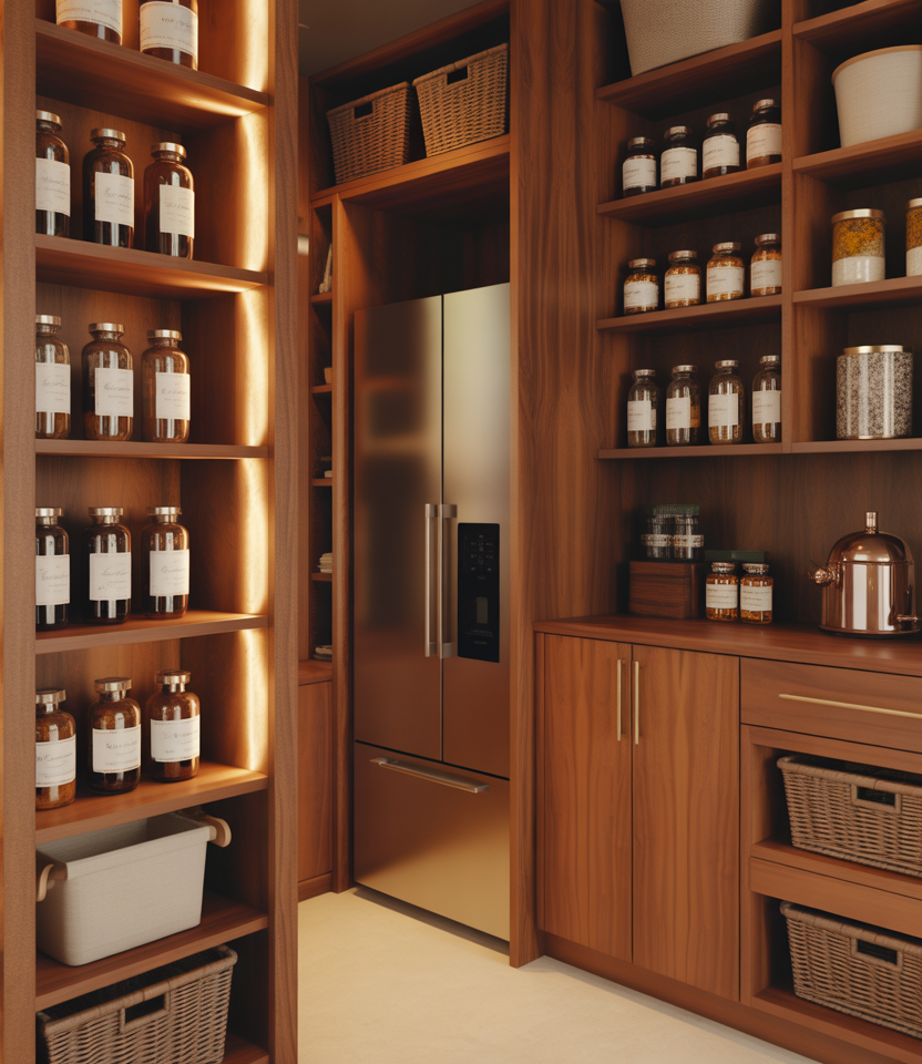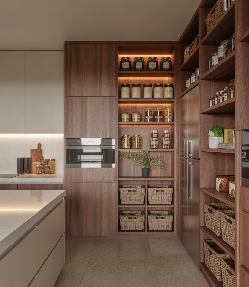 This pantry favors natural crates, perfect for dry goods and fresh produce. Inspired by farm-to-table culture, it adds warmth even in a modern luxury kitchen, especially in an Indian kitchen where onions and spices stay breathable. I tried opening potato bins once—it felt like my grandmother’s farmhouse, in the best way.