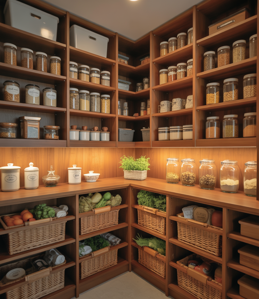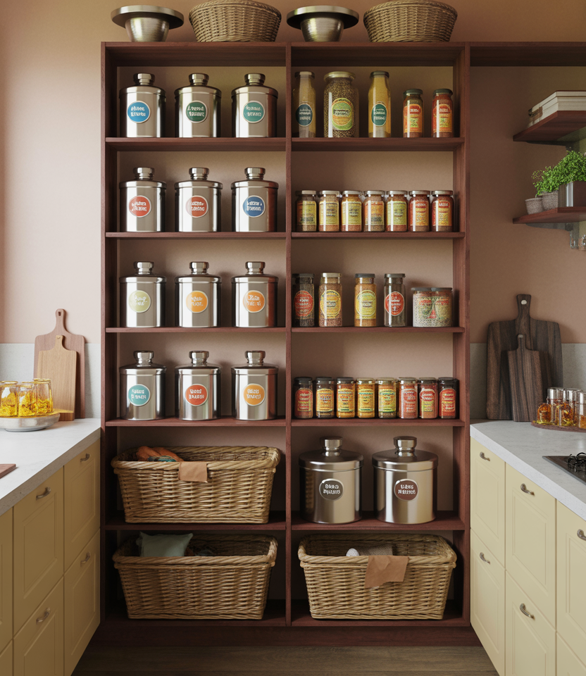 An Indian kitchen pantry embraces spices, grains, and stainless steel containers. Tiered spice drawers, ventilated cabinets, and a warm palette make it functional and soulful. Growing up, my friend’s mom kept ghee and lentils displayed proudly—aromas alone taught culture. Works in open or small walk-in pantry spaces with vibrant accents.