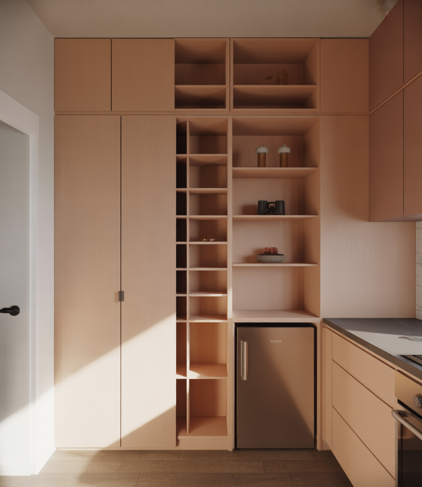 A pantry with sliding doors blends seamlessly into a kitchen accent wall, ideal for a small kitchen that craves hidden storage. Smooth tracks reveal shelves for jars, cans, and even a slim fridge compartment. In my friend’s loft, sliding panels keep clutter tucked away without eating floor space—a useful upgrade for modern home layouts or studio apartments where clean lines matter most.