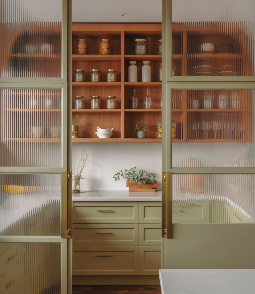 A glass-front pantry turns storage into art, perfect for a luxury open layout. Frosted or ribbed panes keep things tidy-looking while showcasing curated jars. A designer I follow once joked that glass pantries make you buy prettier pasta—true, but worth it. Works in large kitchens or small spaces where reflective surfaces expand the room visually.