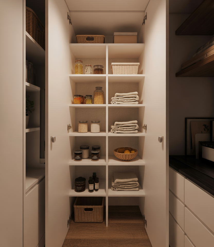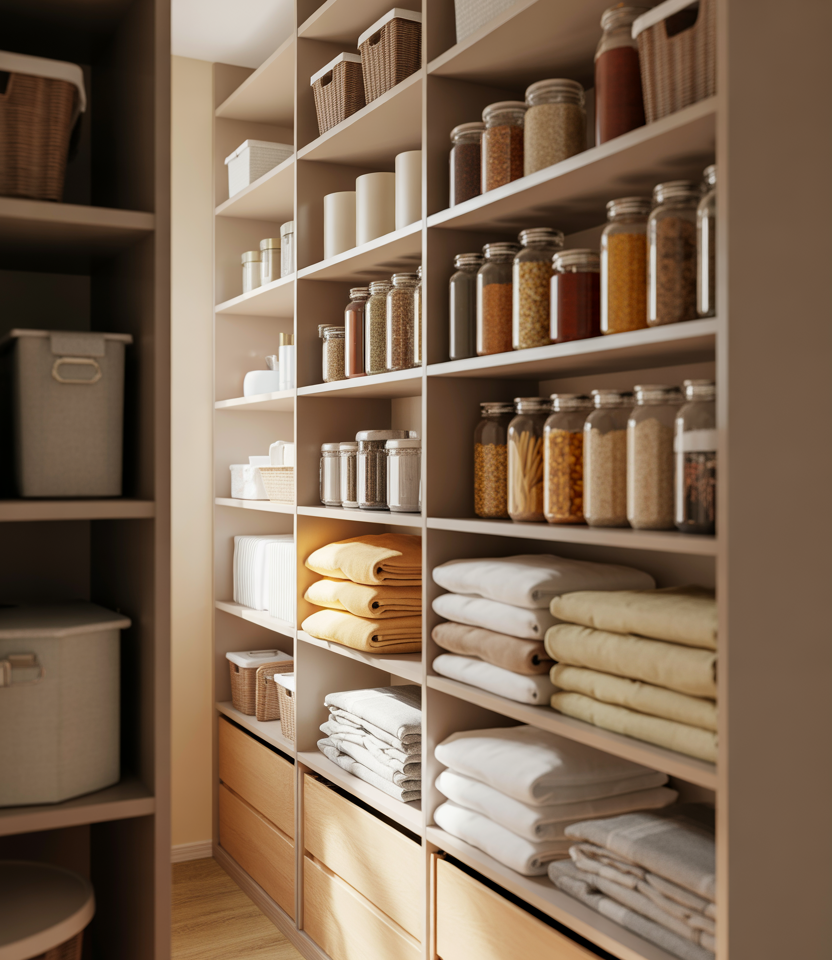 A reach-in pantry combined with linen storage is practical for multipurpose homes. Shelves hold staples and table linens, ideal for a home that values flexible zones. When my cousin downsized, she loved folding napkins beside spice jars—it felt oddly comforting. This hybrid fits small closet conversions or hallways near the kitchen.