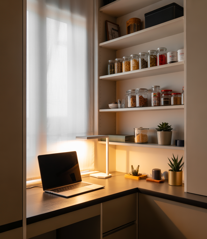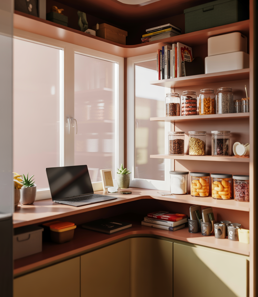 A small office often shares space in compact homes, and stashing pantry shelves behind your work zone keeps snacks and supplies close. Perfect for remote workers who live in small spaces or apartments. My roommate always said her snack shelf fueled better Zoom calls. Great for flexible layouts, especially small corner desks near the kitchen.