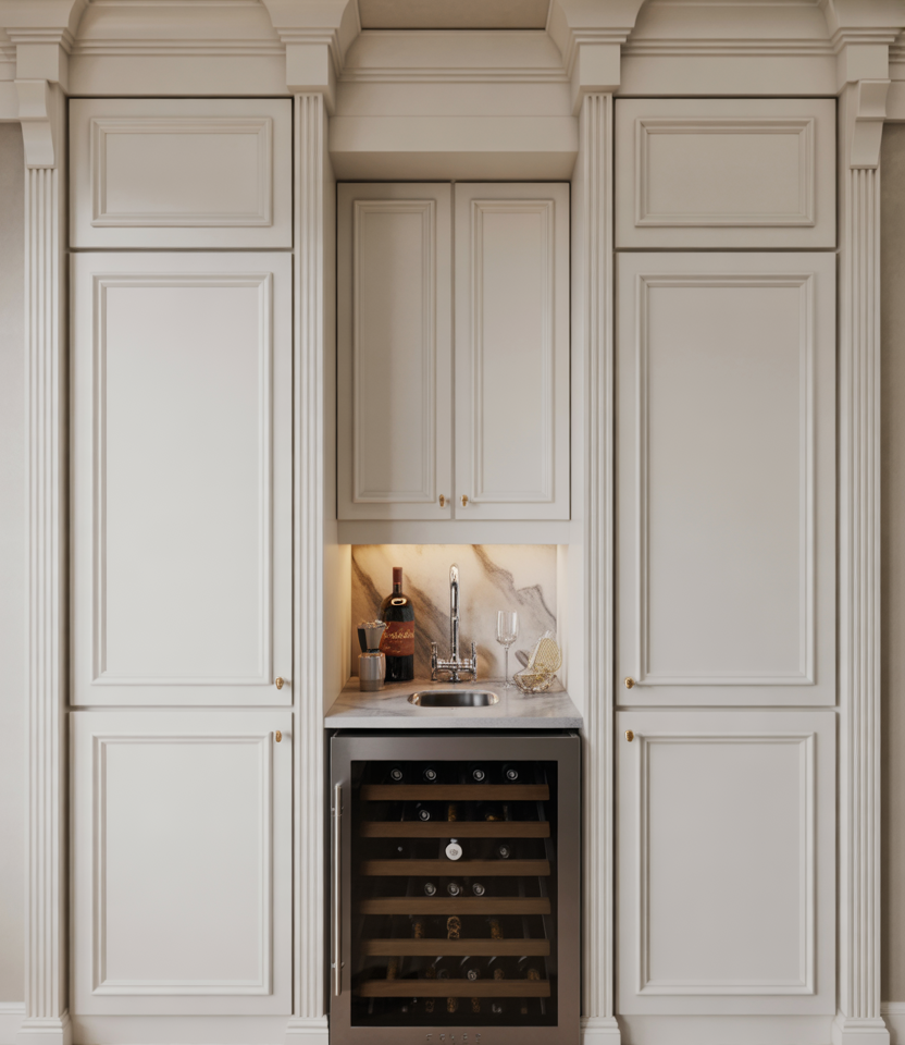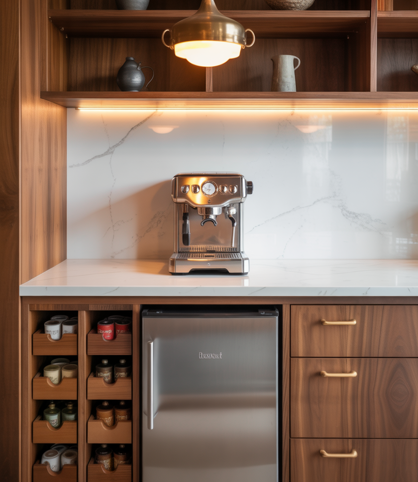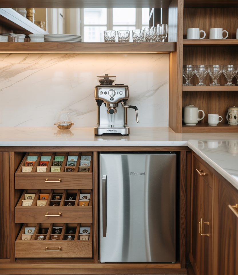 A drinks-focused butler pantry with a coffee station, tea drawers, and mini fridge elevates mornings. Think hotel-level convenience but in your home. My uncle installed one and now swears his cappuccino tastes like vacation. Ideal for large kitchens and entertainers who love curated beverage rituals.