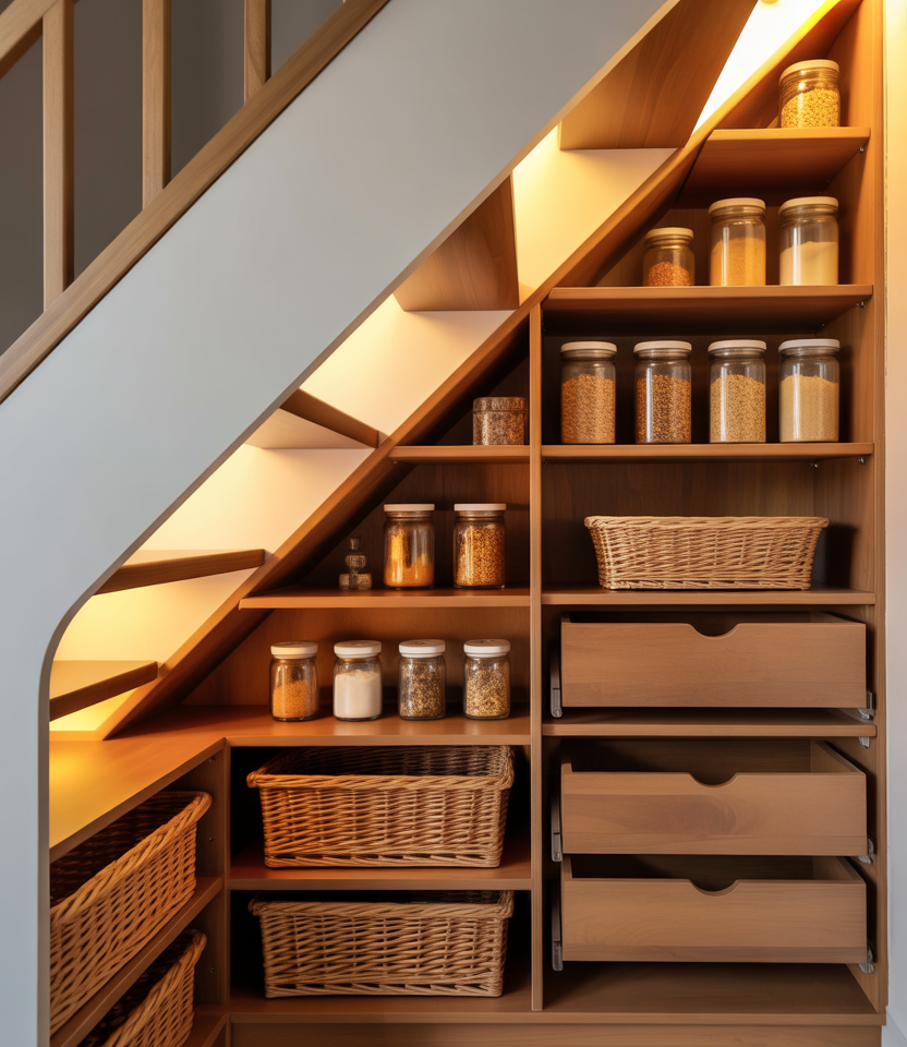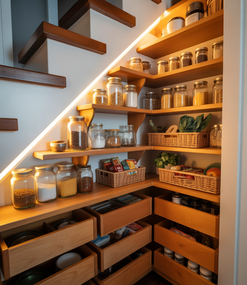Turning the space under the stairs into a pantry is a smart way to stretch small walk footprints or support ideas for small kitchens. Pull-out drawers and angled shelving make every inch count. I once visited a craftsman’s house with this trick—felt like discovering a secret nook. Great for creative home storage.