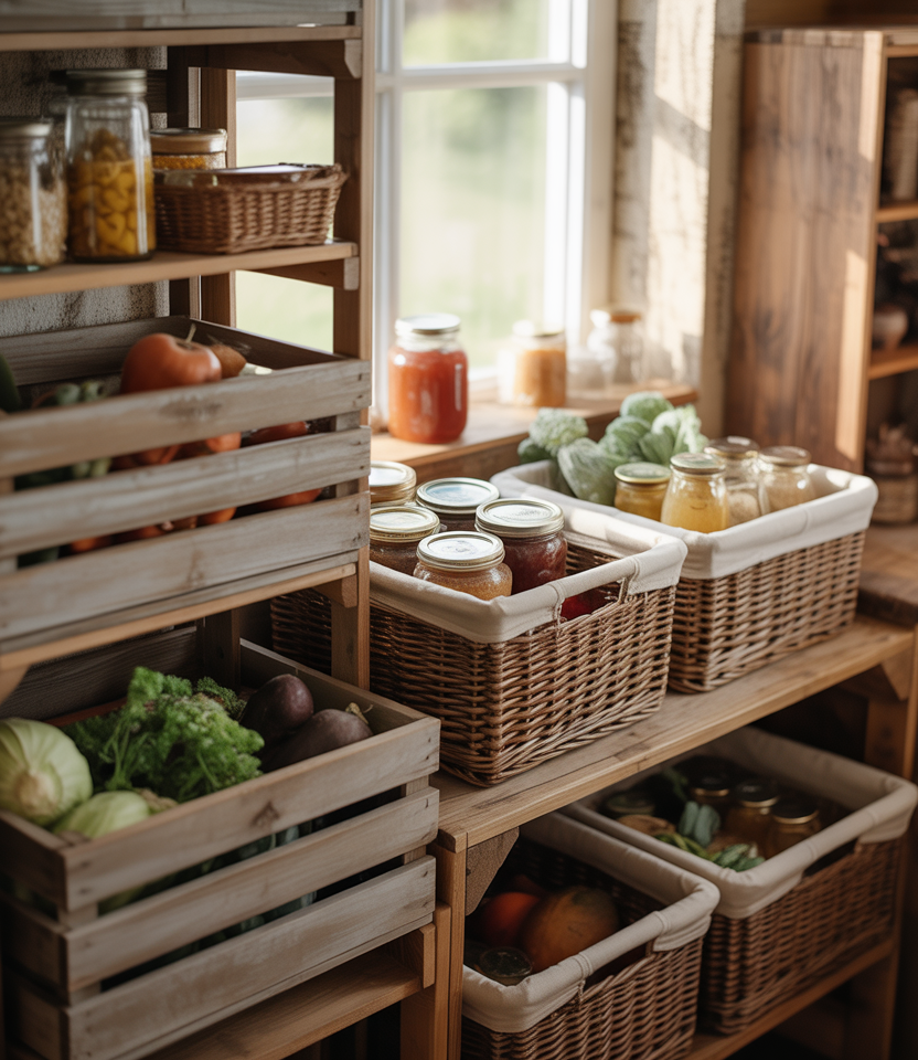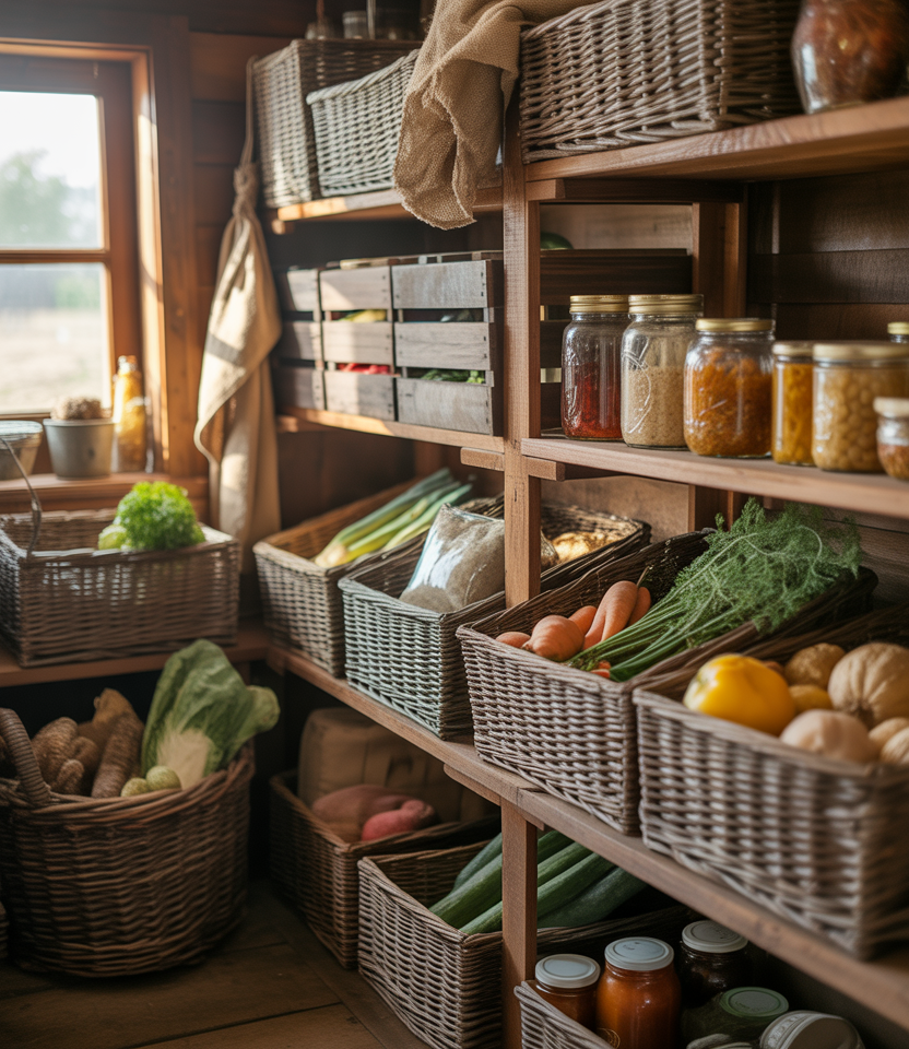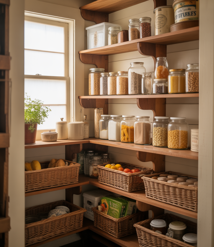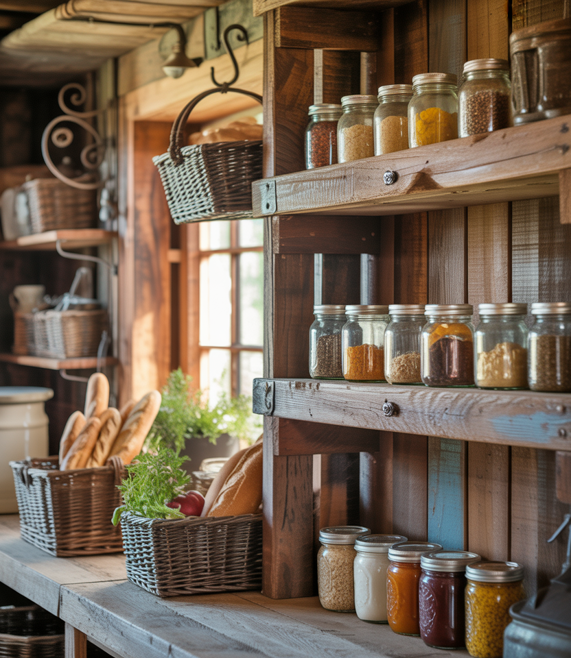 A rustic pantry with reclaimed wood shelves is ideal for homes that blend nostalgia with warmth.