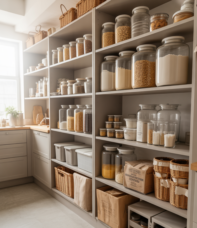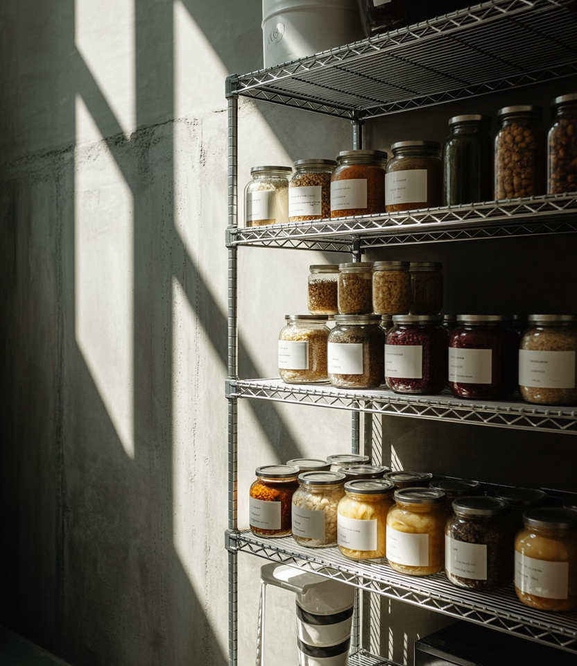 A dry goods–focused pantry suits home bakers and smoothie pros. Think glass jars, oxygen-sealed containers, and freestanding closet-style shelving. A colleague who bakes sourdough stores flours like treasure. Works in suburban homes and walk-in pantry setups near the main kitchen, especially where bulk storage is key.