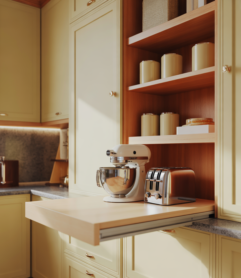 Appliance garages inside a walk-in or reach-in pantry hide mixers and air fryers, freeing countertop space in your open kitchen. A designer on Houzz shared that clients love clutter-free surfaces—my mom agrees; she adores rolling her mixer out like a magic trick. Works for all sizes, from small kitchens to estate layouts.