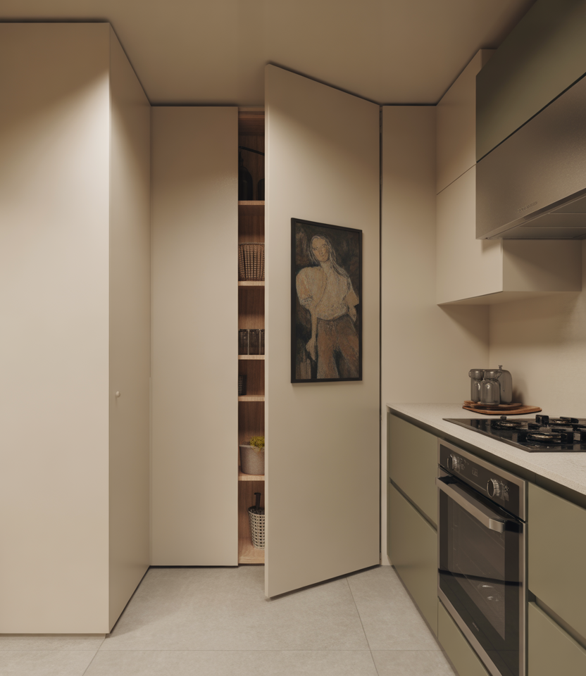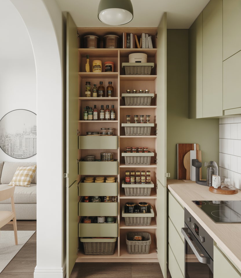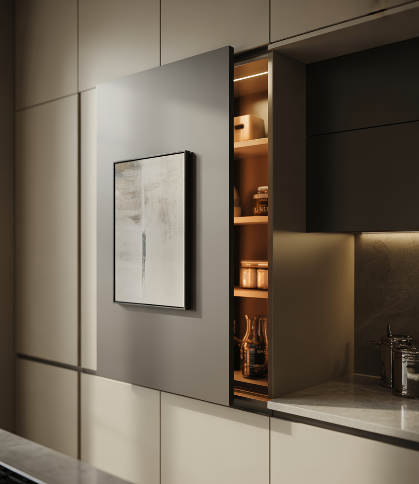 Hidden behind a framed panel or artwork, this stealth pantry idea suits a modern kitchen and keeps visual calm in open floor plans. I once toured a home with a pantry tucked behind a landscape painting—it felt like a movie reveal. Ideal for luxury builds and creative ideas for small kitchens where every inch must multitask without interrupting style.