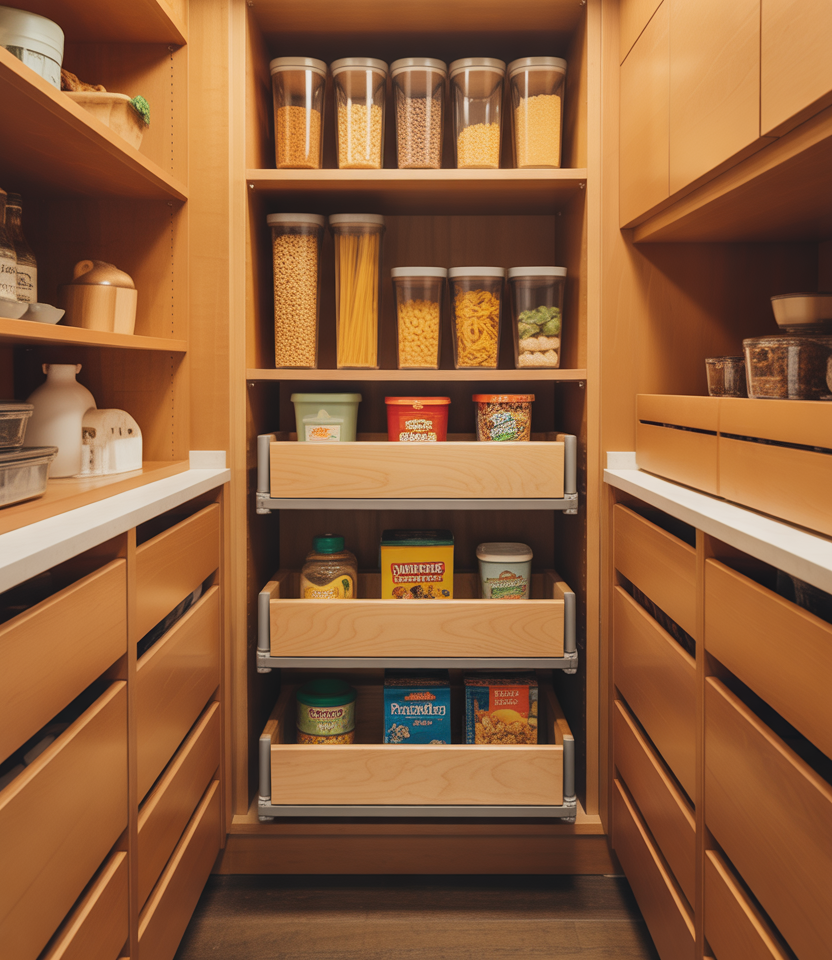 A pantry packed with pull-out drawers brings order to even a small kitchen or home condo. Deep sliding bins keep snacks, spices, and baking supplies visible and reachable—no more digging in dark corners. A coworker says her kids eat healthier now because produce drawers are easy to see. Works beautifully in reach-in spaces and sleek open kitchens where clean lines matter.