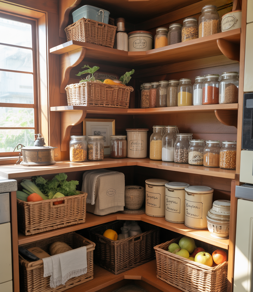 A corner kitchen pantry makes clever use of dead space, perfect for small spaces or a small corner remodel. Door shelves plus angled interior racks keep staples within reach. I once rented a bungalow with a tiny corner pantry—awkward but charming, and surprisingly roomy. Ideal for cottage or farmhouse interiors and budget-friendly builds.