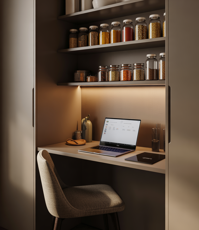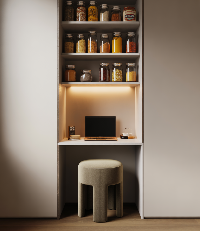 Remote workers are blending food storage and workspace: a small office nook inside the pantry. Shelves above, laptop zone below, printer tucked beside snacks. It sounds odd until you try it—my cousin swears productivity rises when trail mix is within reach. Best for large homes or creative reach in renovations.