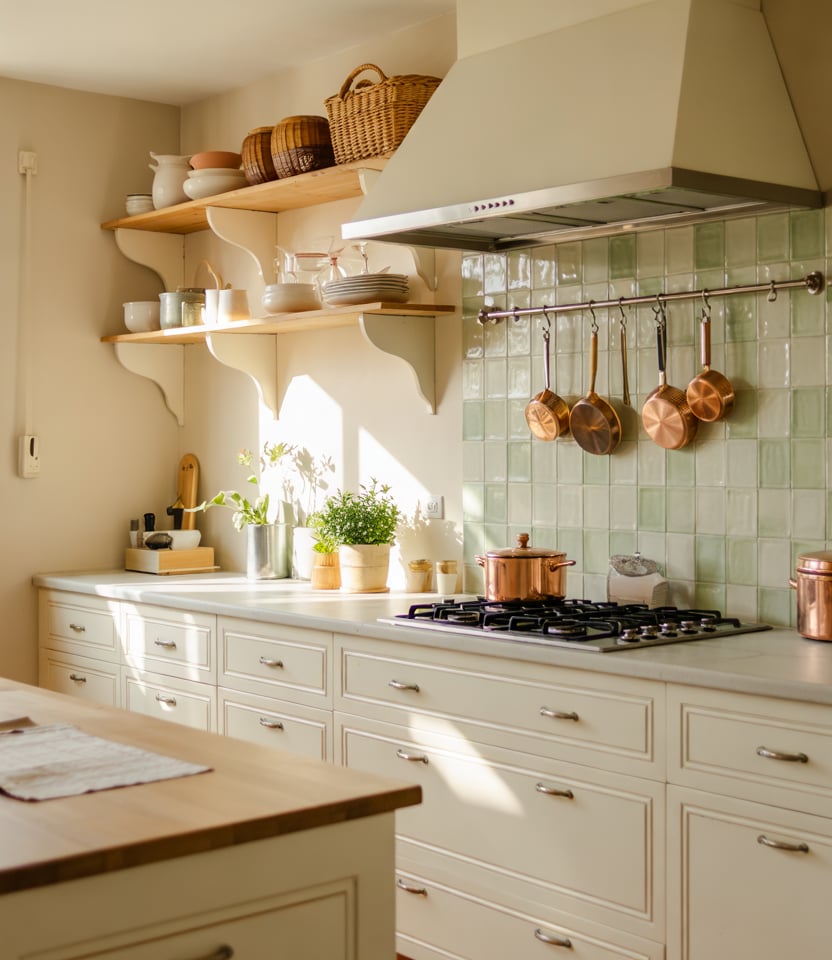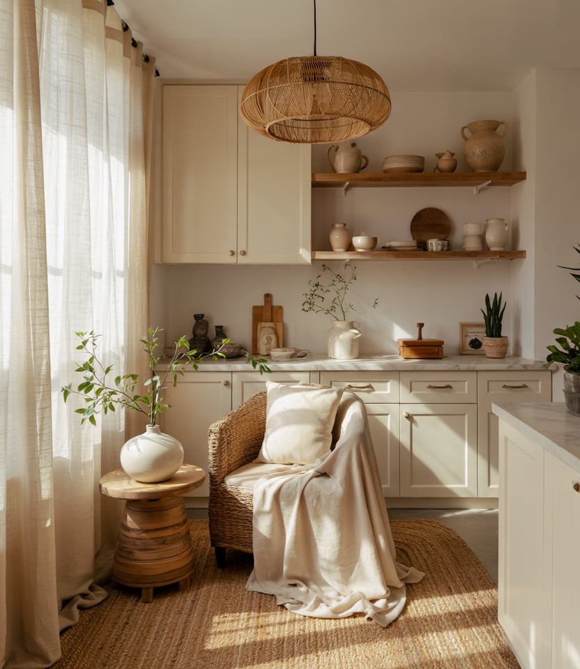 For a relaxed boho feel, white cabinets serve as the perfect backdrop. Add woven décor, earthy wood and accents, subtle green tones, and warm gold hardware for a lighthearted kitchen that still feels curated. The blend is playful but never messy.