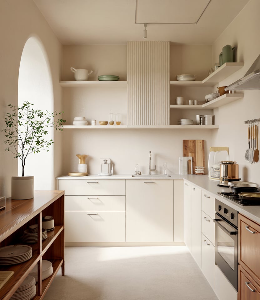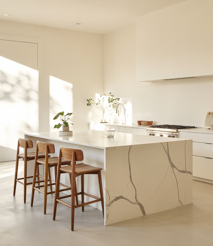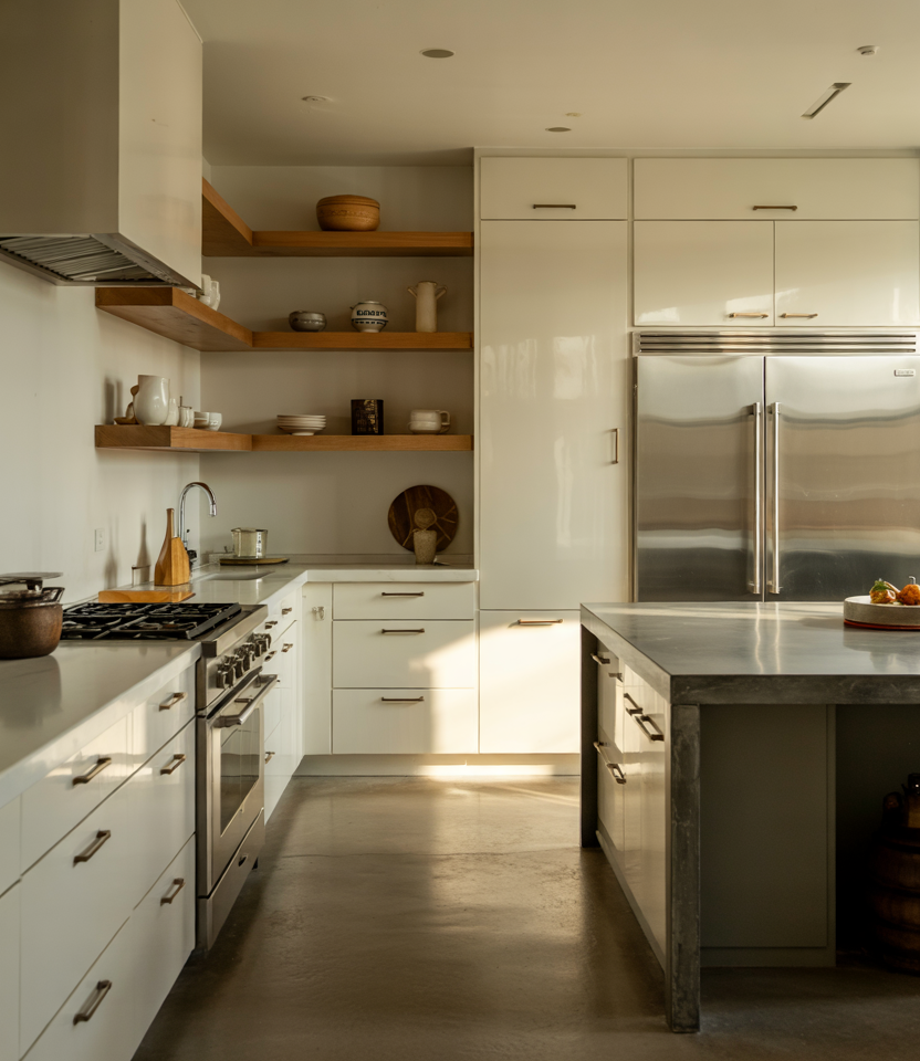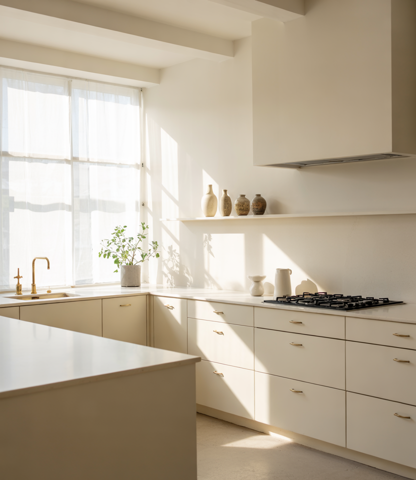 For those seeking calm minimalism, white cabinets paired with smooth surfaces and gentle hues feel effortlessly serene. Soft touches of creamy tones, understated gold handles, and muted gray accents create a minimalist but warm aesthetic—not the stark minimalism of past decades.