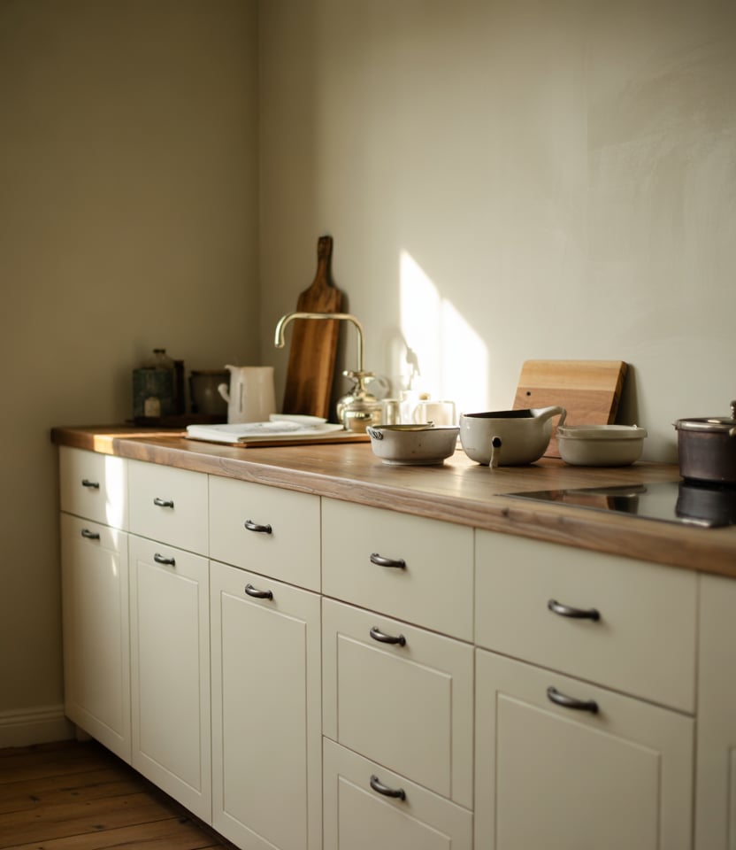 Adding wood grain to a white kitchen instantly introduces warmth and character. Combining clean cabinets with a butcher block top, gentle rustic décor elements, and sleek black pulls creates a timeless look that feels both functional and cozy for everyday cooking.