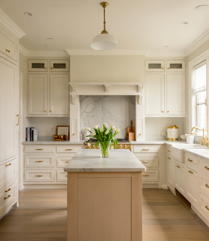 21 White Kitchen with Subtle Gold and Stone Harmony