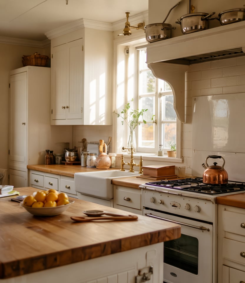 Cottage styling brings charm through delicate contrast and understated materials. White cabinets paired with gold hardware, a warm butcher block top, and thoughtful wall color ideas create a cozy kitchen that feels lovingly collected over time.