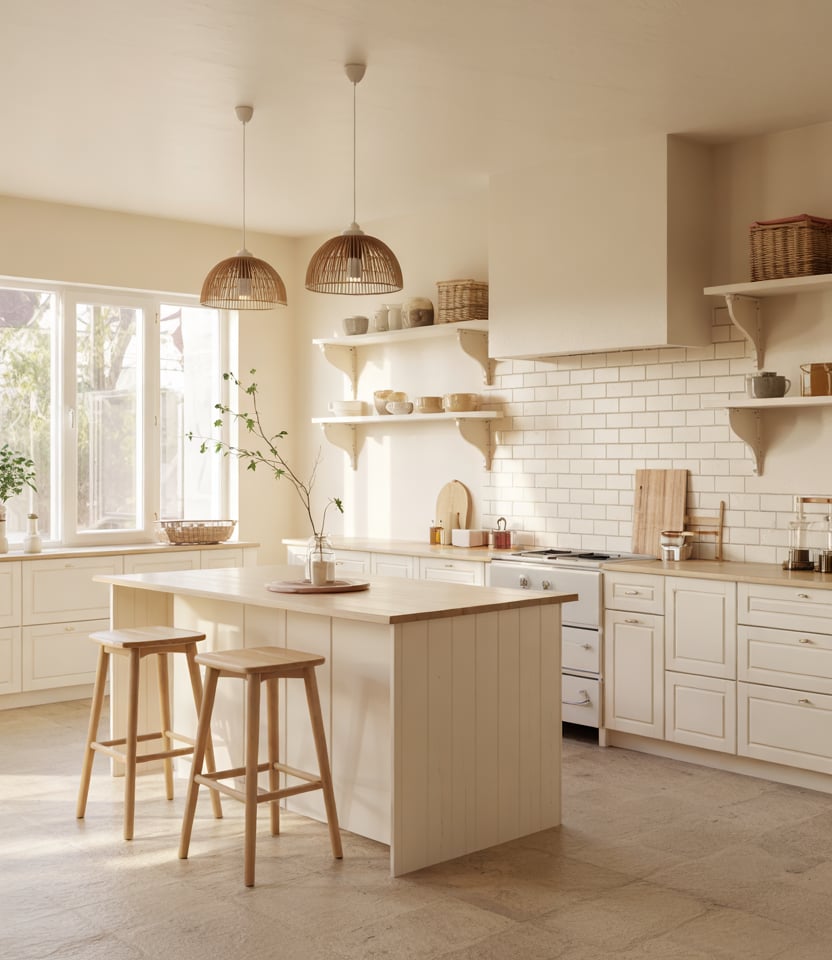 For a soft Scandinavian vibe, white cabinetry pairs beautifully with hints of creamy tones, minimalist shoji-inspired textures, and a refined wood island. This combination creates a bright and breathable atmosphere that suits both small and open-concept spaces.
