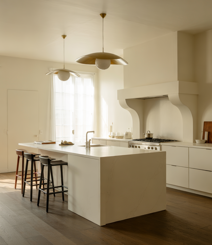 Lighting is becoming a centerpiece in 2026 kitchens, especially when contrasted against clean white cabinets. Pairing sculptural pendants with touches of Off Black, a smooth Quartz counter, and a grounded Wood island adds depth while keeping the palette modern and refined.
