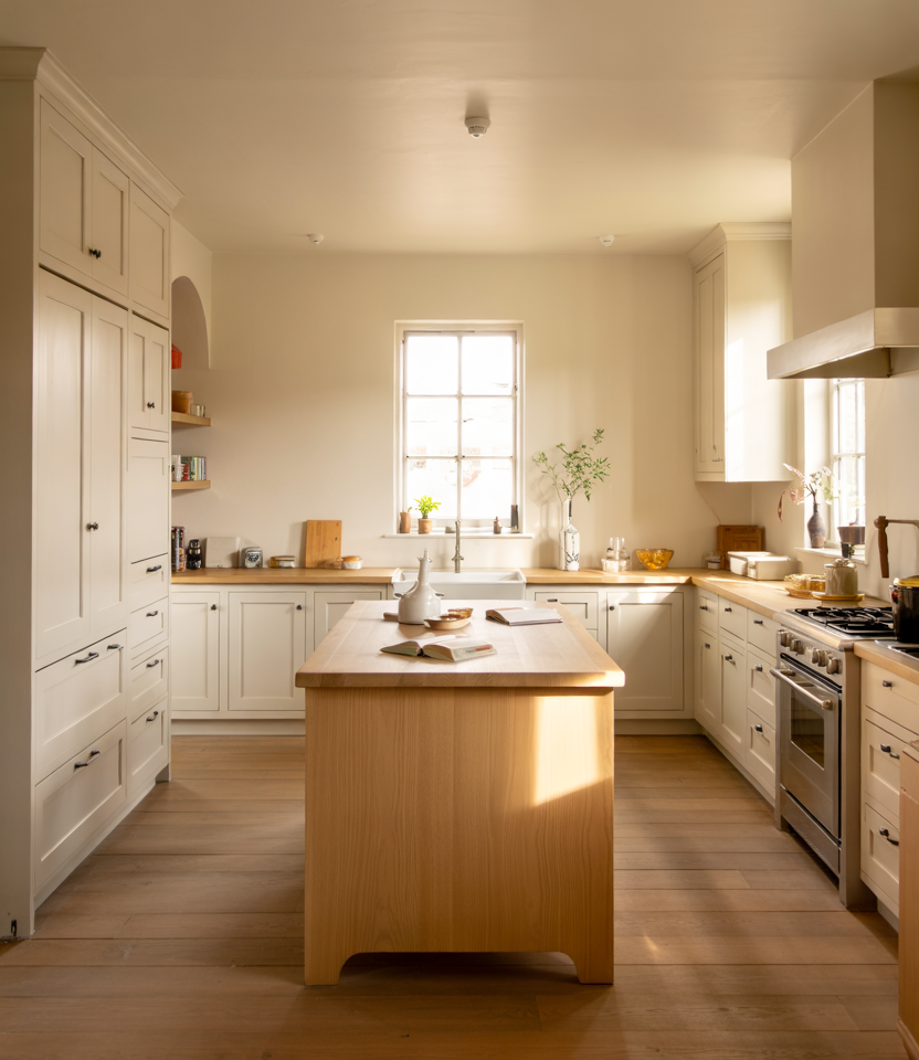 For a gentler take on white, creamy cabinetry pairs seamlessly with warm metals and subtle detail. Many homeowners highlight the look with creamy finishes, mixed black hardware, and touches of white oak, creating a cozy blend of modern and classic appeal that suits both brand-new builds and updated mid-century homes.