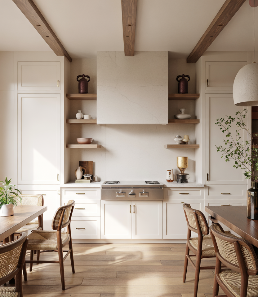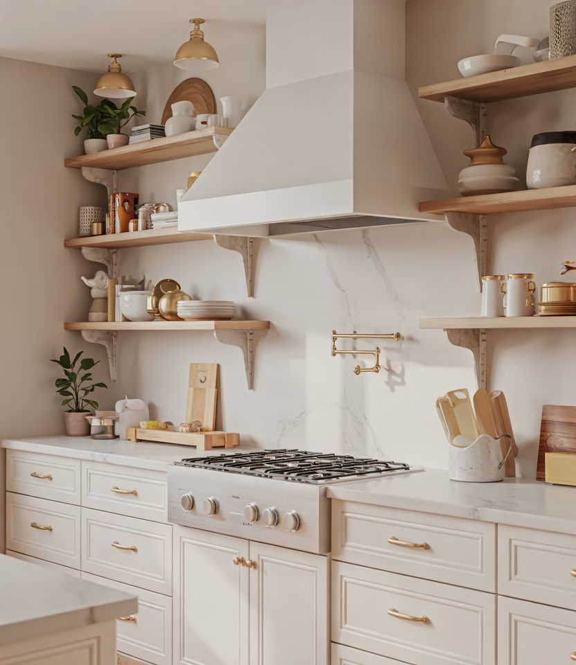 White cabinets gain depth when paired with layered neutrals. Blending subtle gray tones, refined quartz surfaces, and brushed gold handles makes the kitchen feel polished without becoming overly formal—an easy win for modern American homes.