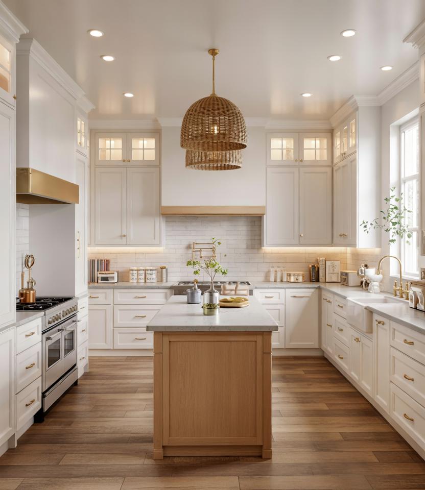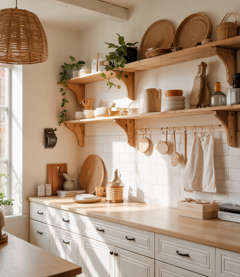 For a relaxed boho feel, white cabinets serve as the perfect backdrop. Add woven décor, earthy wood and accents, subtle green tones, and warm gold hardware for a lighthearted kitchen that still feels curated. The blend is playful but never messy.