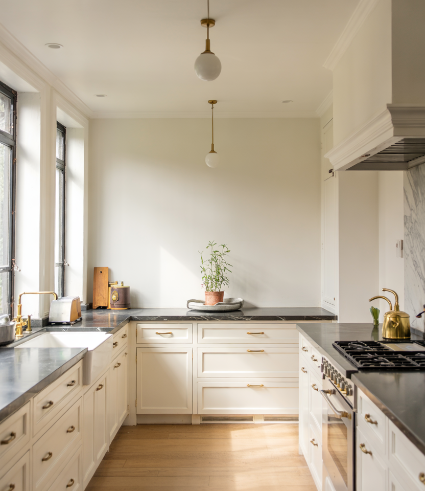 High-contrast kitchens are trending again, and pairing bright cabinets with dark accents can be striking. Mix sleek black countertops, linear off-black trim, and refined gold handles to create a dramatic but elegant composition that still feels contemporary.