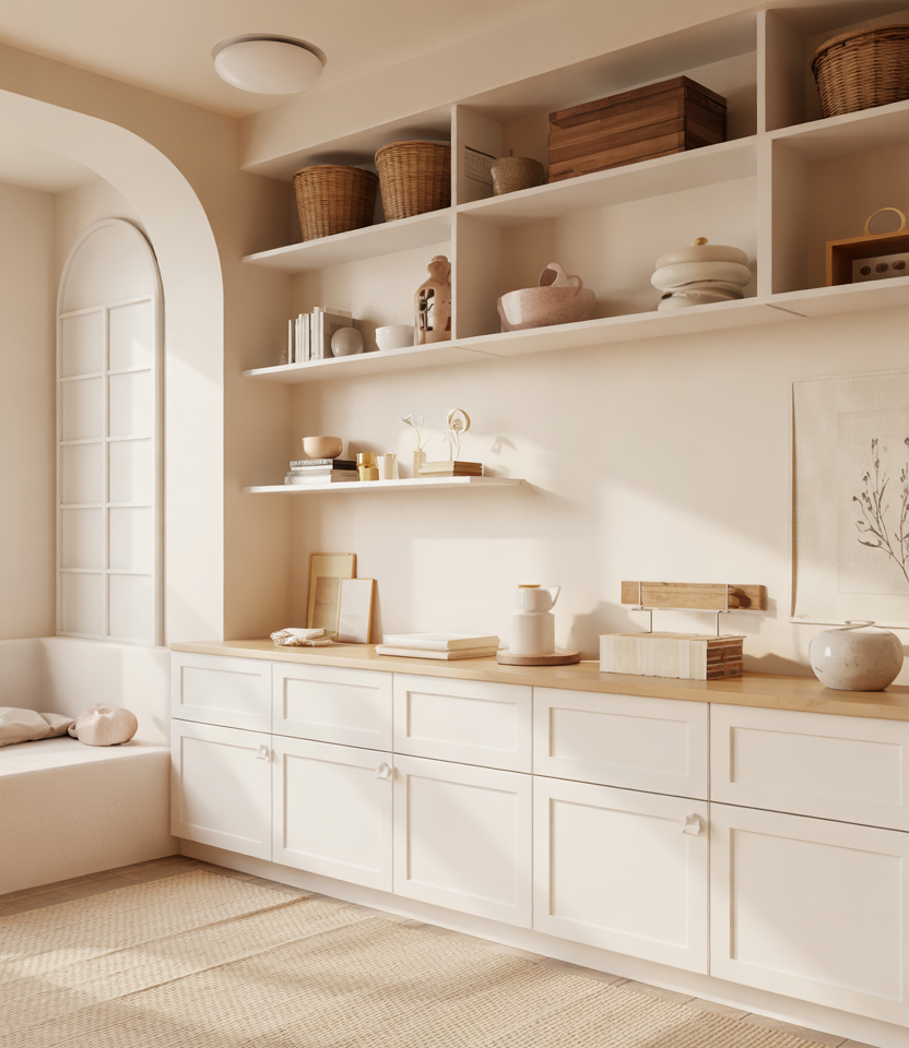 For a peaceful, airy look, white cabinets pair beautifully with sliding-panel details. Incorporating shoji-like textures, soft creamy tones, and clean backsplash ideas creates a hybrid modern-Japanese aesthetic that feels spacious and soothing.