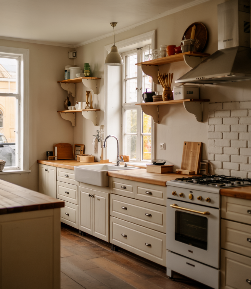 Cottage styling brings charm through delicate contrast and understated materials. White cabinets paired with gold hardware, a warm butcher block top, and thoughtful wall color ideas create a cozy kitchen that feels lovingly collected over time.