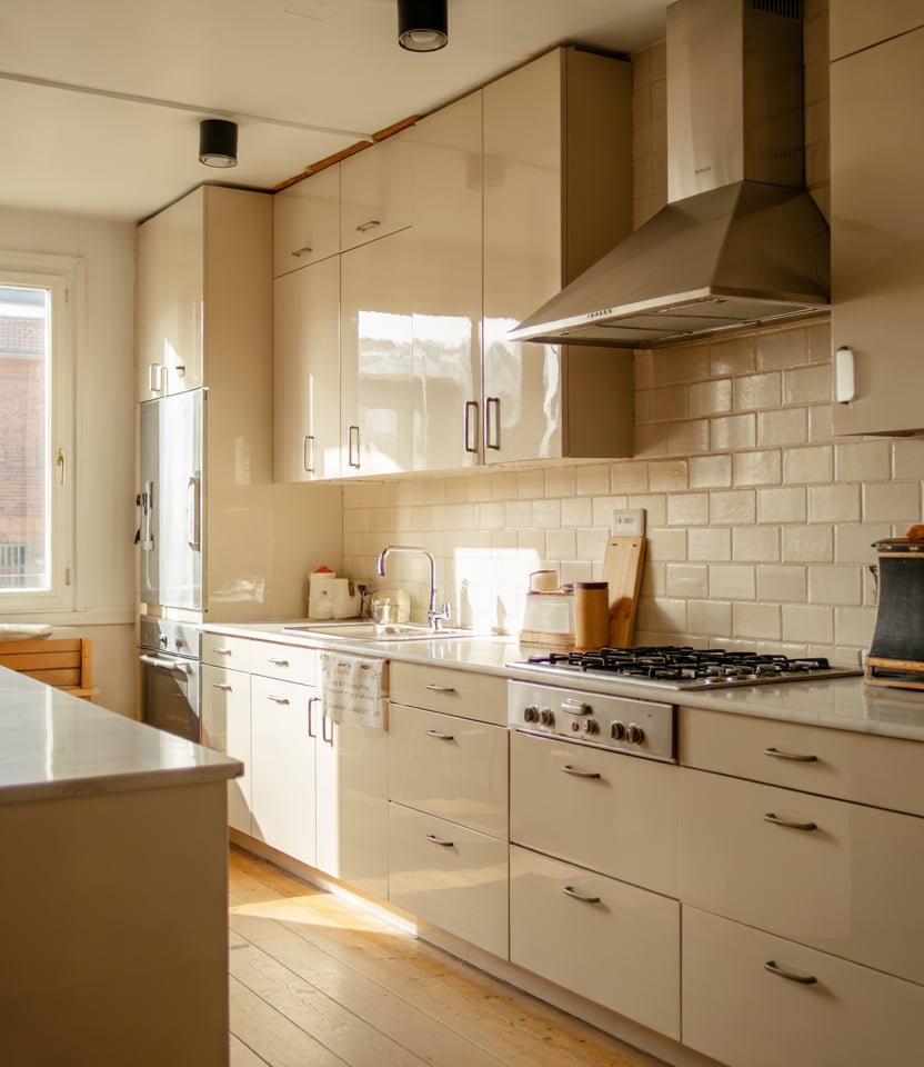 Gloss-front cabinets amplify natural light, making them ideal for city apartments. Paired with minimal accents like glossy surfaces, streamlined black pulls, and a touch of rustic texture, the look feels modern but not cold—perfect for compact kitchens needing more visual lift.