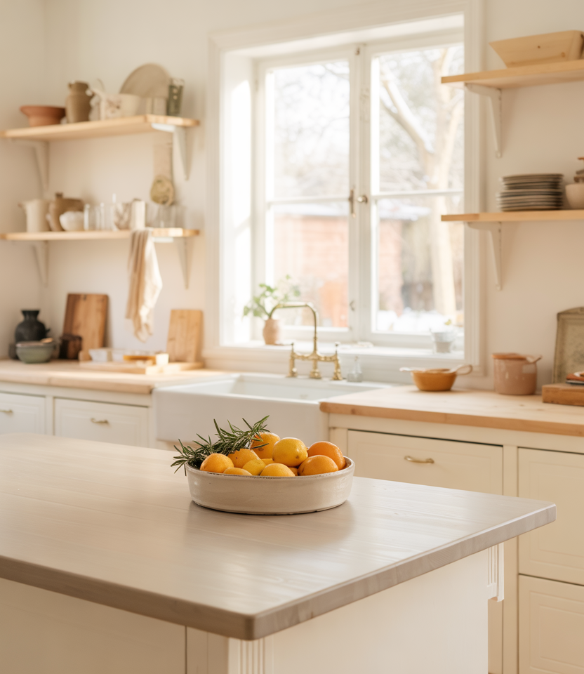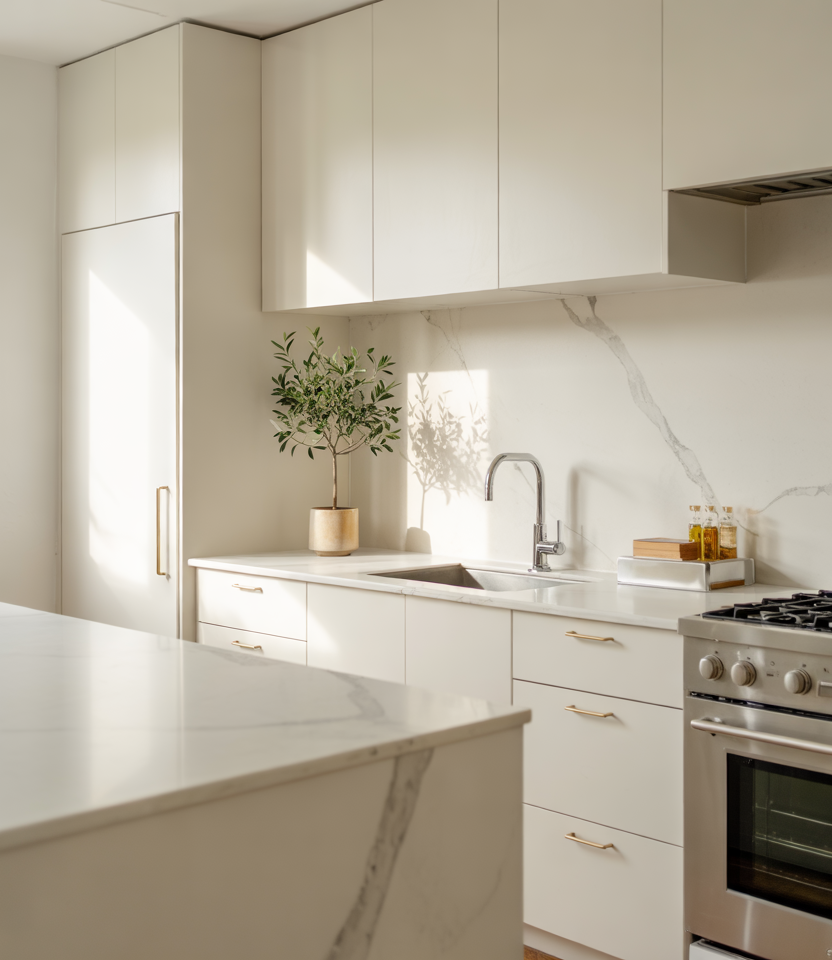 For those seeking calm minimalism, white cabinets paired with smooth surfaces and gentle hues feel effortlessly serene. Soft touches of creamy tones, understated gold handles, and muted gray accents create a minimalist but warm aesthetic—not the stark minimalism of past decades.