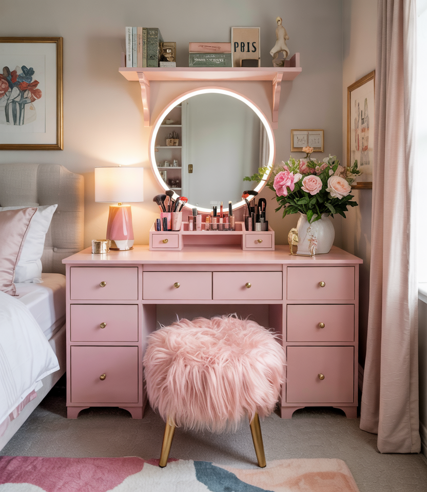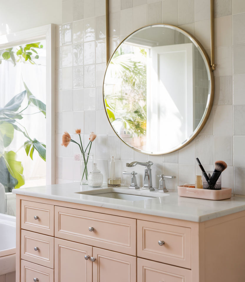 A pink vanity doesn’t need to feel childish; many influencers now show chic, classy, muted rose palettes for adult spaces. Blended with brushed metals and soft lighting, this look offers a sophisticated twist on feminine charm. It suits medium to large rooms where color becomes a feature rather than a splash.