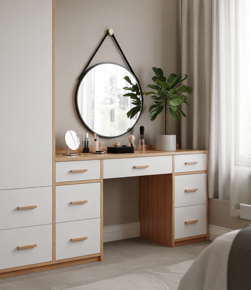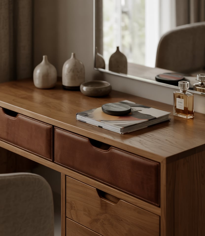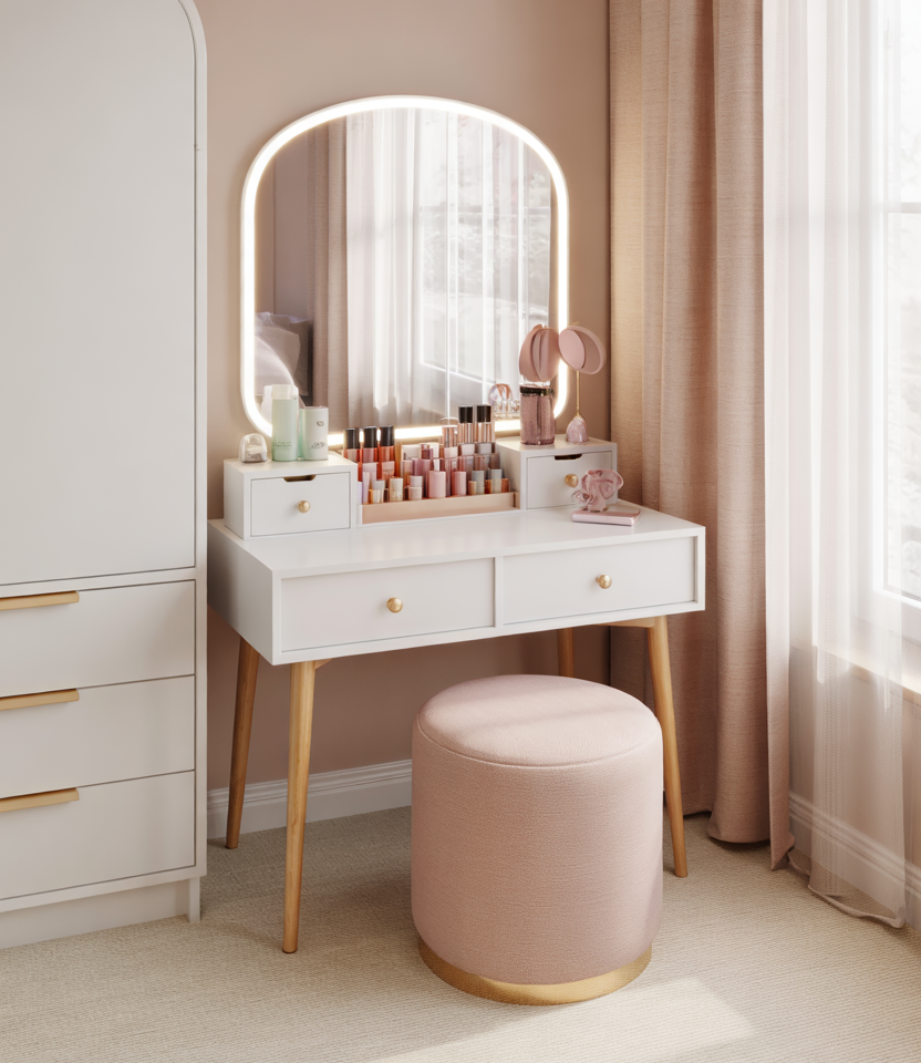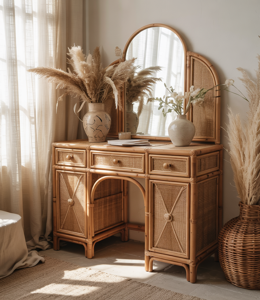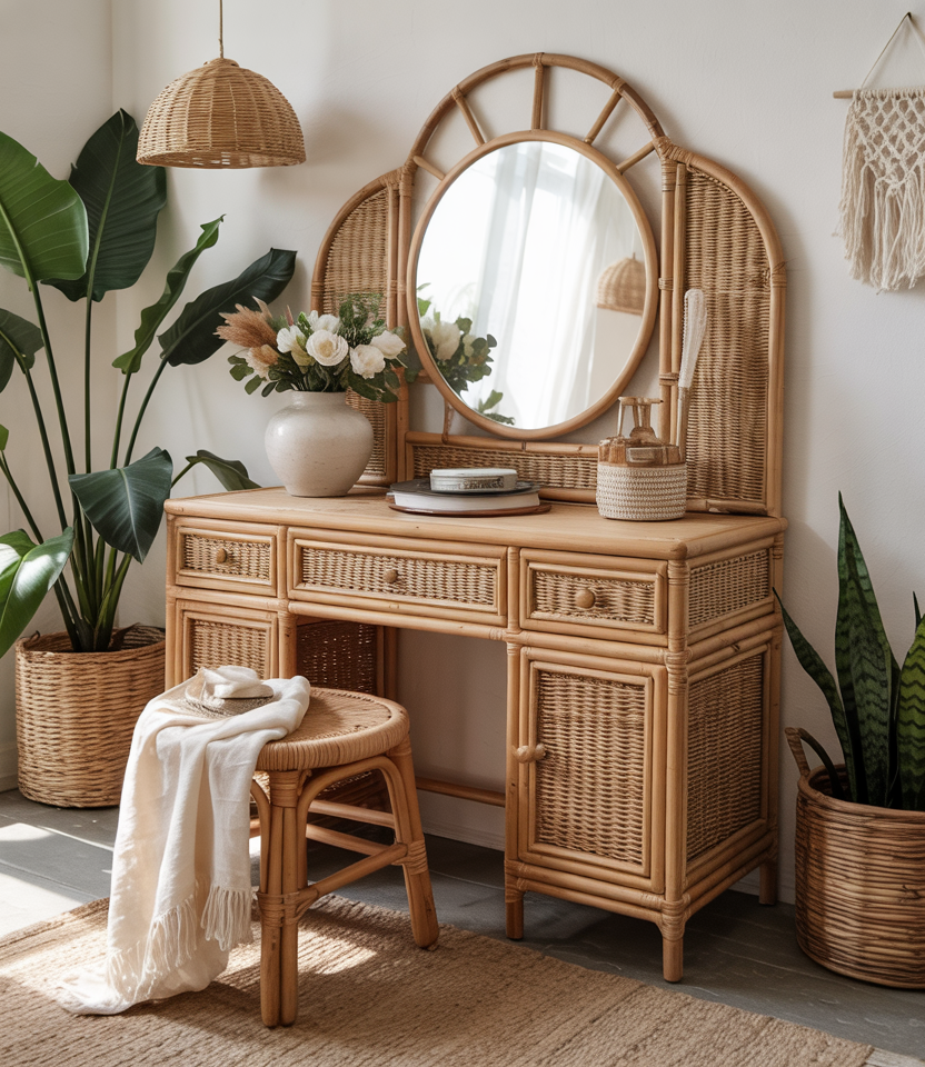 A rattan vanity brings a warm, bohemian charm while staying light and casual. Popular in décor magazines for 2026, its woven textures complement soft fabrics and earthy palettes. It’s perfect for bedrooms that lean toward natural fibers and relaxed makeup organization.