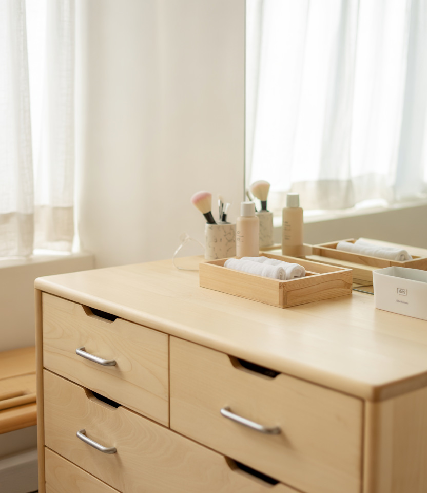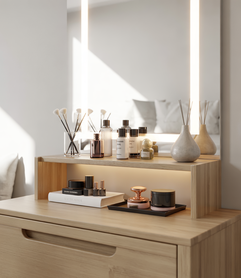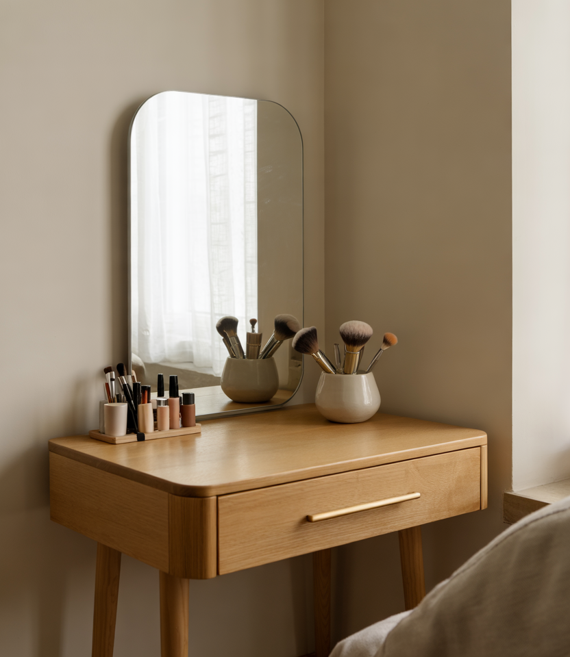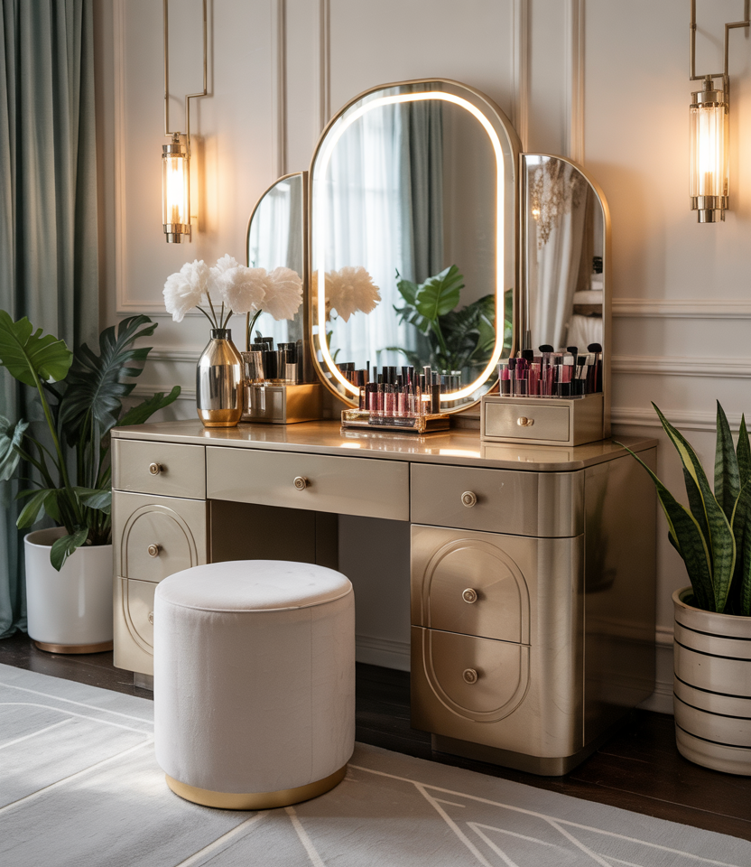 A Scandinavian vanity emphasizes pale wood, clean geometry, and a calming aesthetic that supports slow-living routines. Designers praise its balance of warmth and practicality, especially for bedrooms needing subtle visual expansion. This style keeps makeup essentials tidy while maintaining an uncluttered mood ideal for soft, modern mornings.
