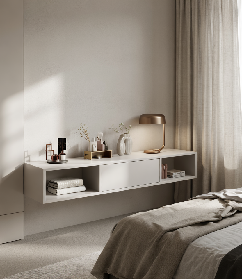 A floating vanity shelf creates an airy aesthetic that suits both compact and open bedrooms. Home decorators love how it saves floor space while still offering room for makeup and mirrors. This idea is ideal for small spaces where a minimalist, lightweight design keeps the room looking open and uncluttered.