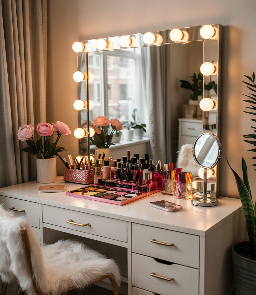 A classic bulb-lit mirror evokes studio glamour that bloggers praise for boosting confidence during styling. This large vanity suits those craving a bold yet functional setup that highlights makeup details. Perfect for bedrooms where a statement feature brings energy and personality.