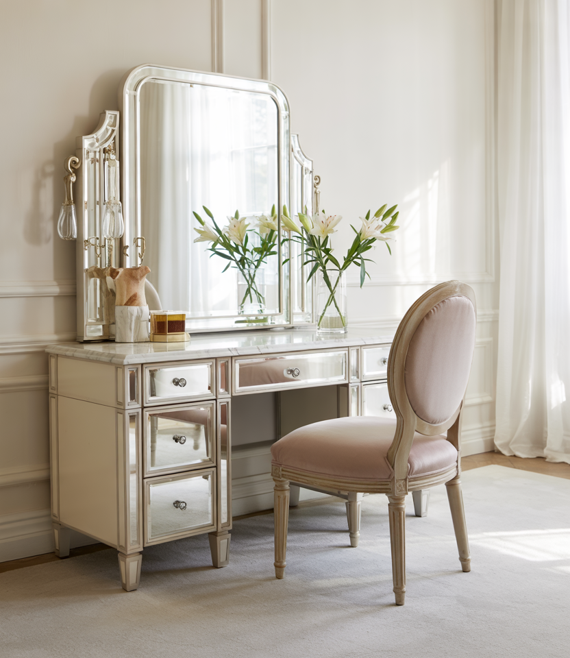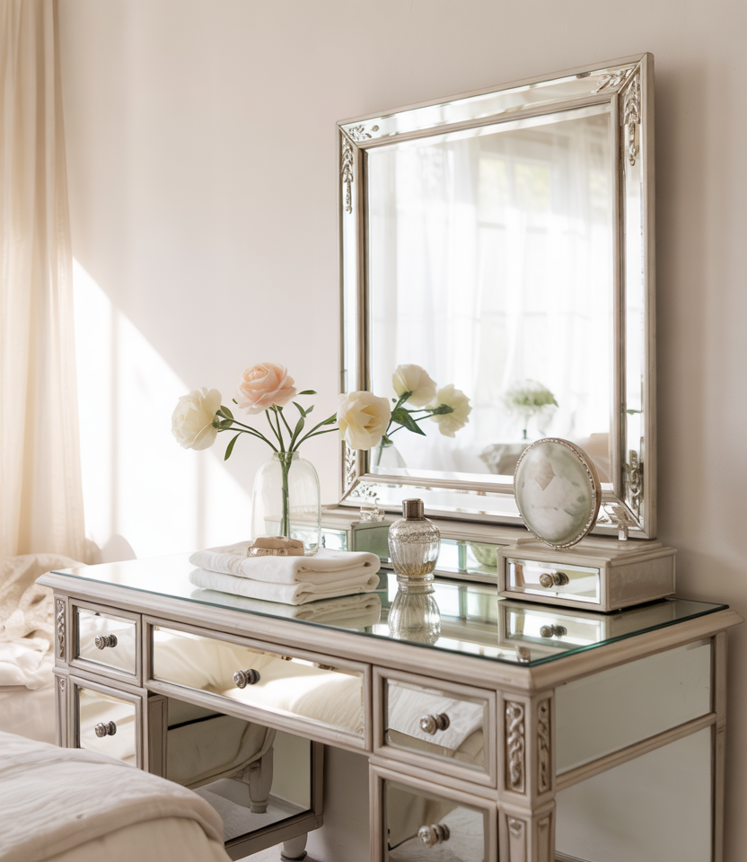 A mirrored vanity table instantly adds shine and an elegant glow to any bedroom. Designers note that reflective surfaces brighten corners and enhance the aesthetic feel of the room. This idea works beautifully in chic interiors that appreciate sparkle without overwhelming the space.