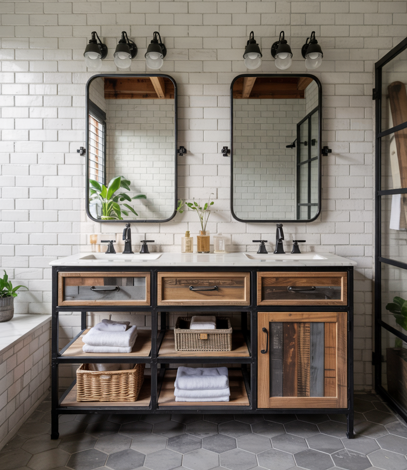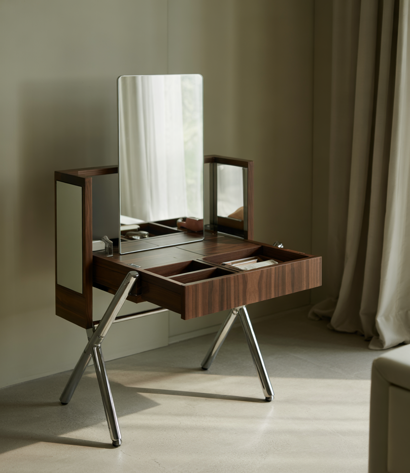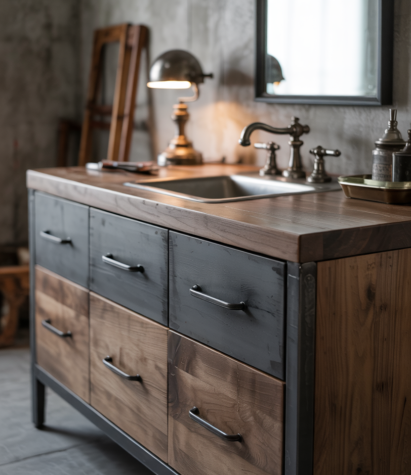 Industrial décor blends matte metal with rich wood, creating a grounded yet stylish look. This vanity idea brings an urban edge, ideal for bedrooms with exposed textures or vintage-inspired details. It offers sturdy organization while keeping the aesthetic raw and modern.