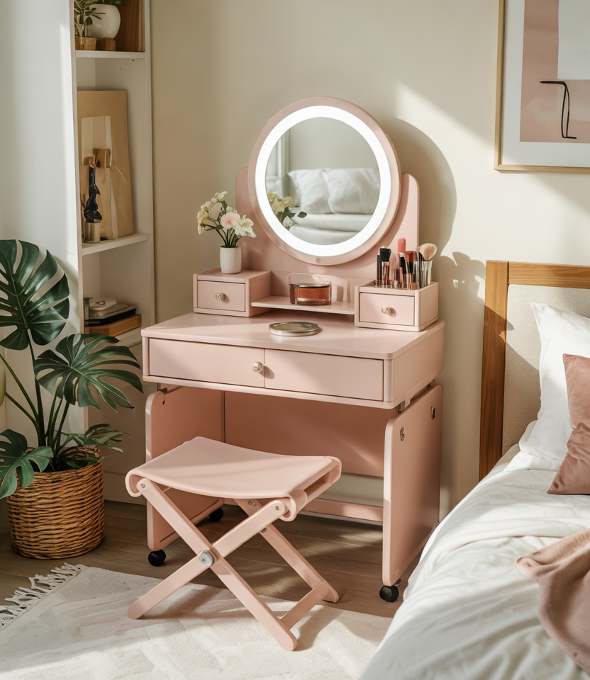 A folding vanity is ideal for a small room or multi-use bedroom. Editors often highlight these for renters who need portability and flexible organization. The fold-out surface keeps essentials tidy while offering a quick spot for makeup without permanently taking up space.