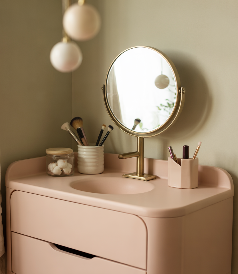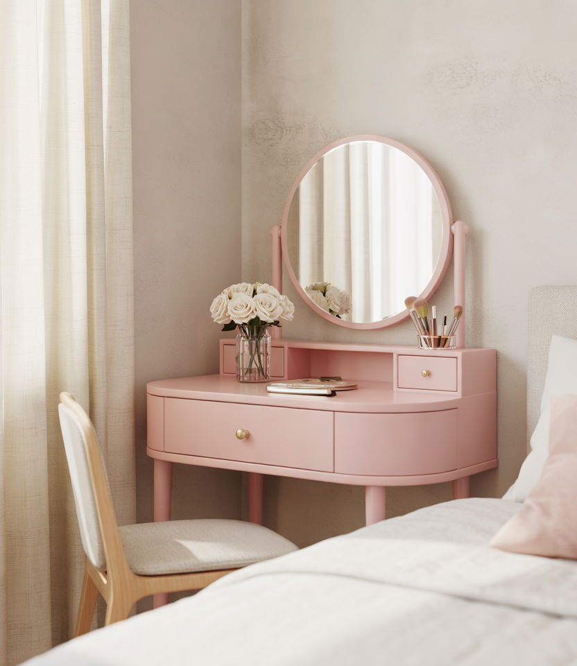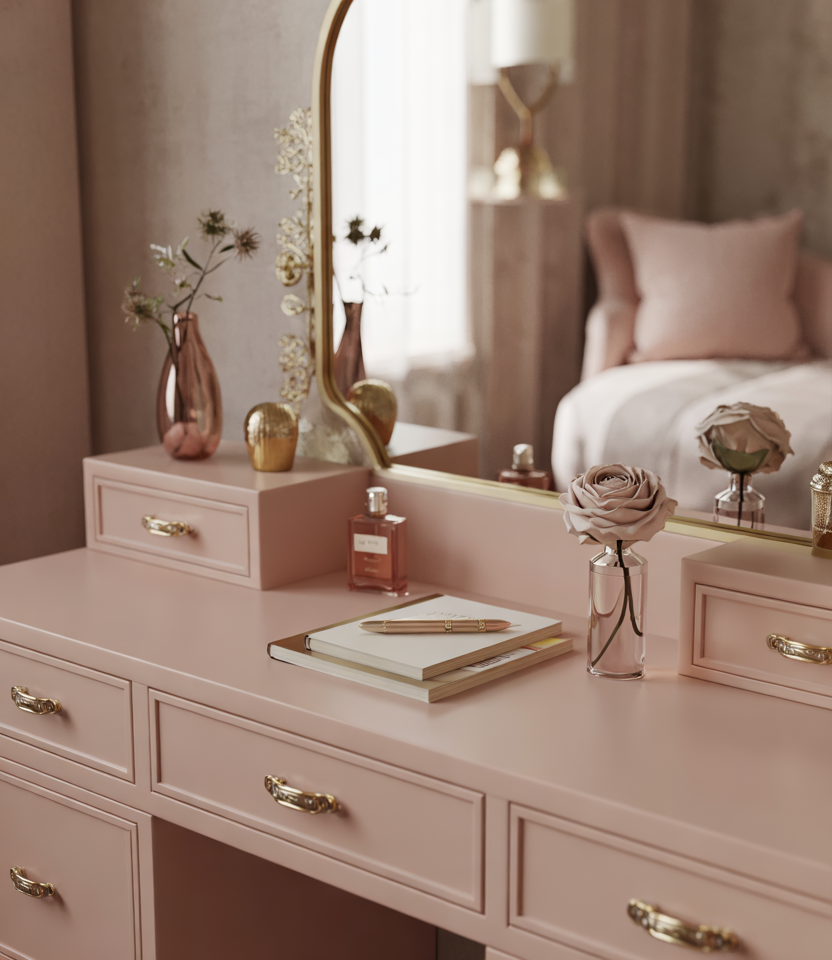 A muted pink vanity placed in a corner creates a calm, feminine retreat without overpowering the room. Designers love this subtle tone for modern bedrooms that seek softness. Perfect for a corner makeup area where simplicity and warmth make everyday routines feel special.