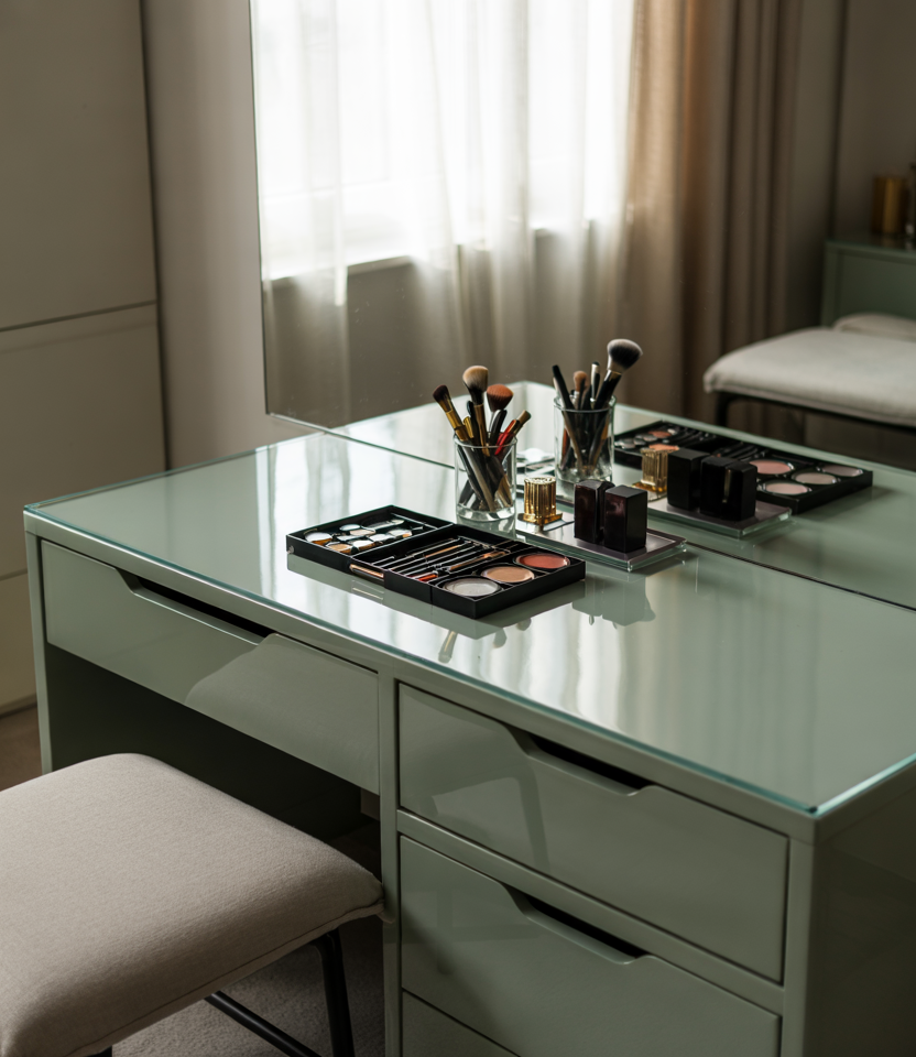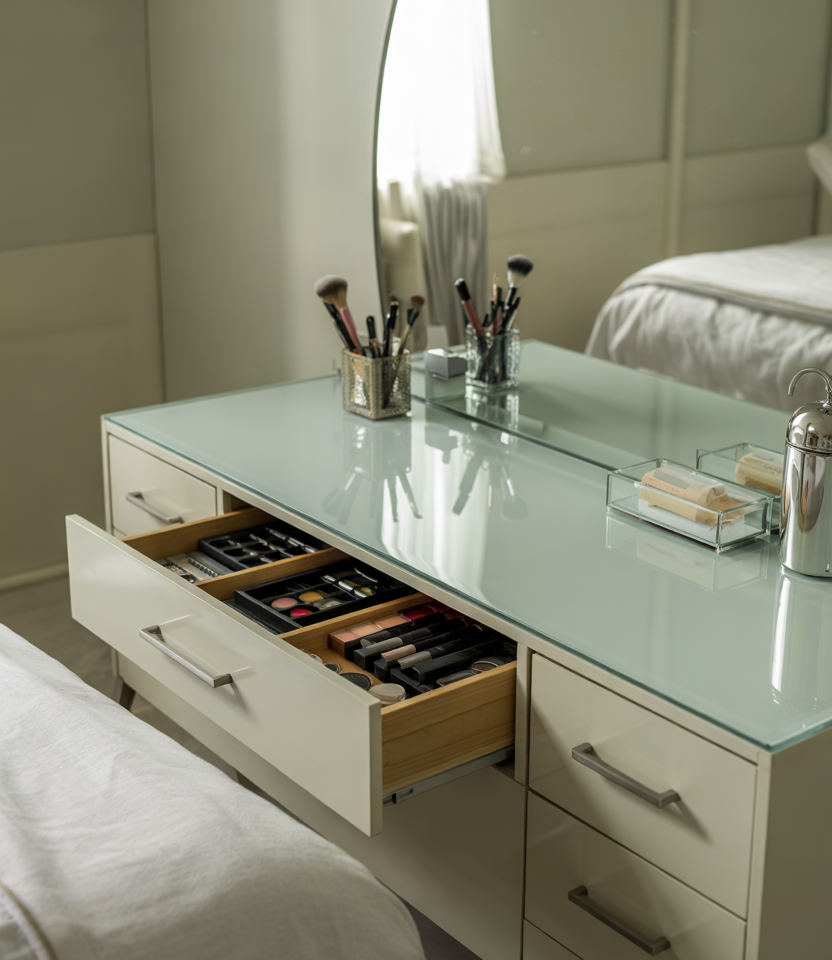 A glass-top vanity adds a classy, modern touch while keeping the tabletop visually light. Hidden drawers offer superior organization, perfect for those who love clean surfaces and clutter-free beauty routines. It suits contemporary bedrooms striving for a polished aesthetic.
