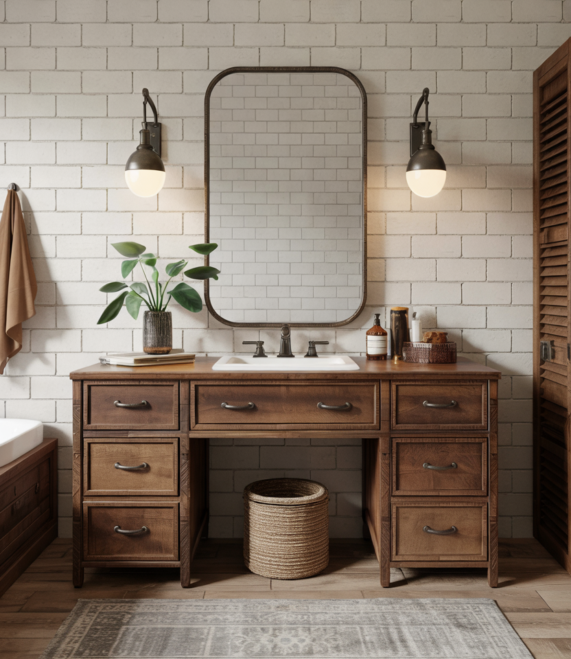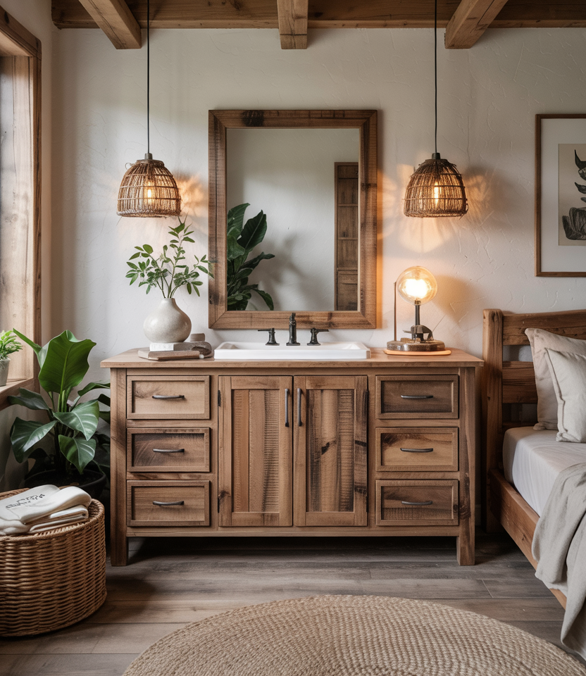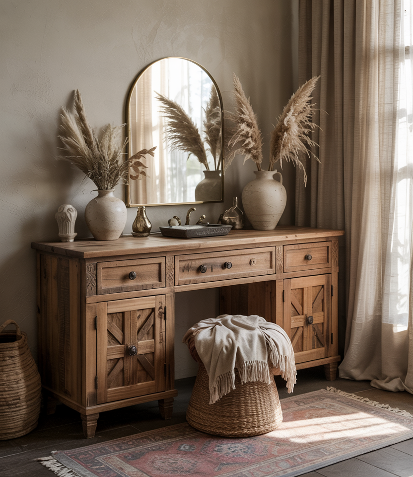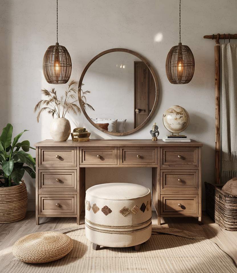 A western and bohemian hybrid mixes earthy tones, woven textures, and antique-style accents. This idea works well in eclectic bedrooms where personality is the priority. Inspired by designers who champion handcrafted detail, the style makes everyday makeup routines feel effortless and personal.
