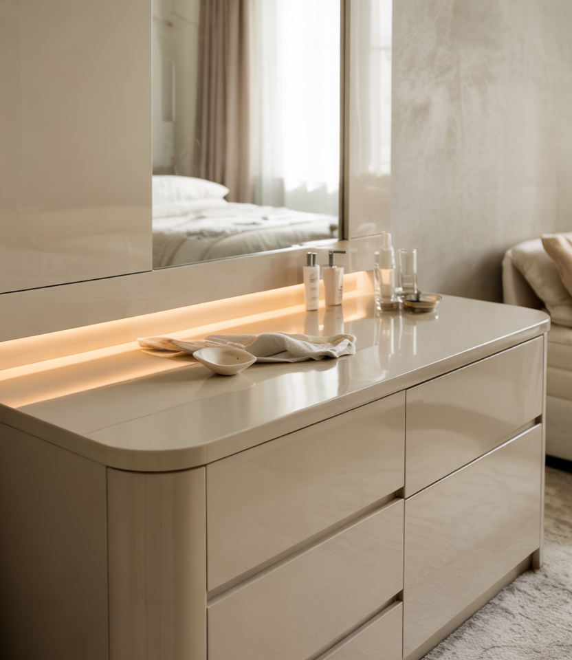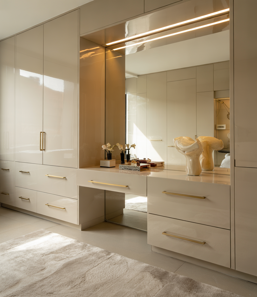 Home bloggers often rave about how a modern luxury vanity setup enhances the entire bedroom. A built-in design brings seamless elegance, mixing glossy finishes, warm lighting, and sleek drawers. This style suits anyone craving an upgraded modern luxury feel with smart organization and quality materials integrated into the wall.