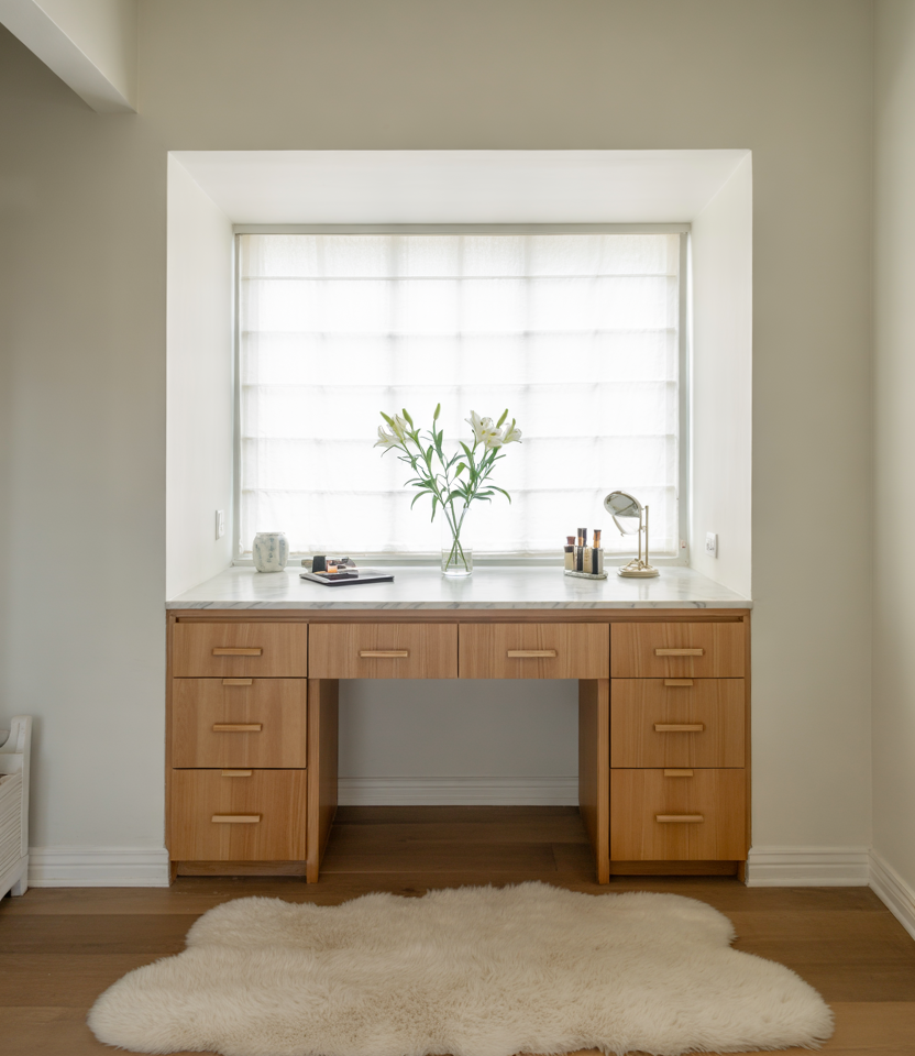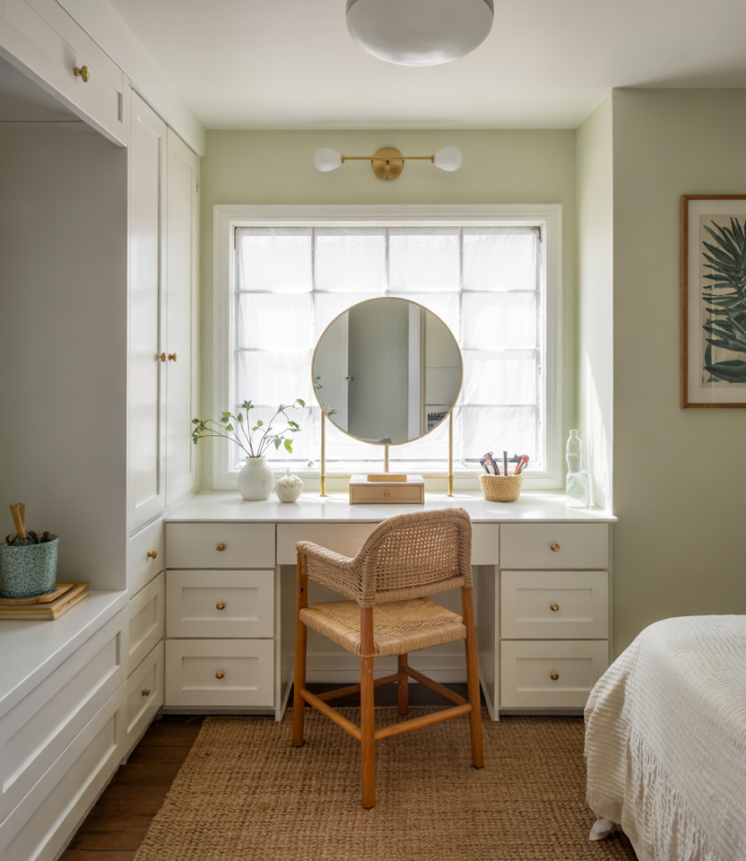 A vanity tucked beneath a window offers soft natural light that decorators consistently recommend for flawless makeup application. This built-in nook makes clever use of underutilized space while giving the bedroom a welcoming aesthetic. Ideal for readers who want practicality paired with peaceful morning rituals.