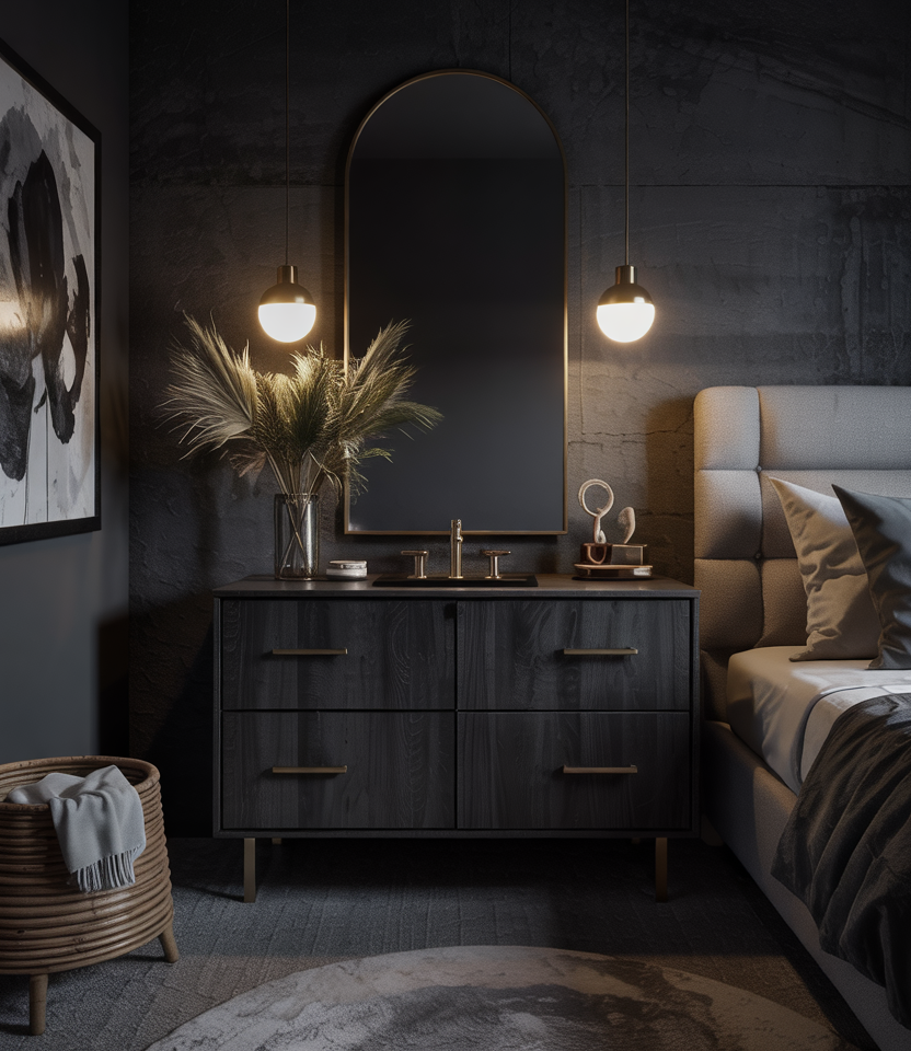 Combining deep black tones with textured wood creates a moody, grounded atmosphere that feels refined yet approachable. This idea works for those craving dramatic contrast without sacrificing warmth. Designers often highlight this palette for bedrooms aiming for depth, personality, and streamlined organization.
