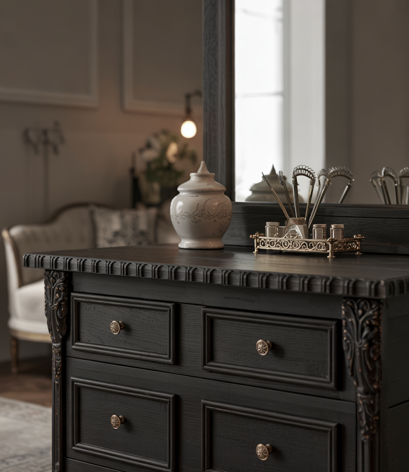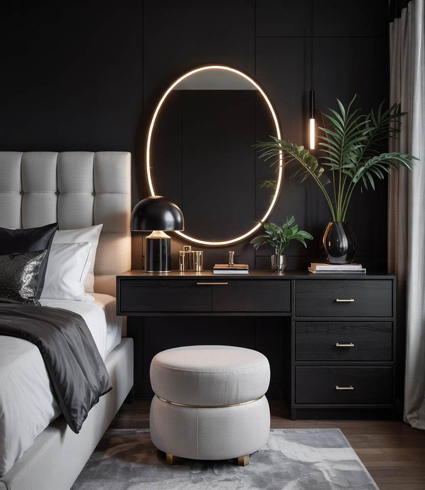 Bold decorators like those at The Everygirl highlight the rise of black accents for a confident, glam vibe. A black vanity suits those who want a dramatic but minimal look, especially in rooms where contrast adds depth. Even with its sleek lines, this approach keeps organization central while bringing undeniable personality.