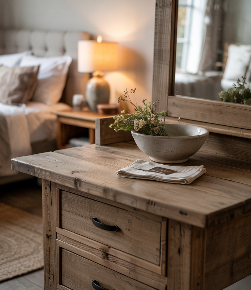 A rustic vanity brings warmth through natural wood textures and handcrafted details. Many readers love this direction because it feels grounded and nostalgic while still fitting current trends. In bedrooms where comfort rules, a rustic setup blends sincerity with function, pairing earthy tones with simple makeup storage.
