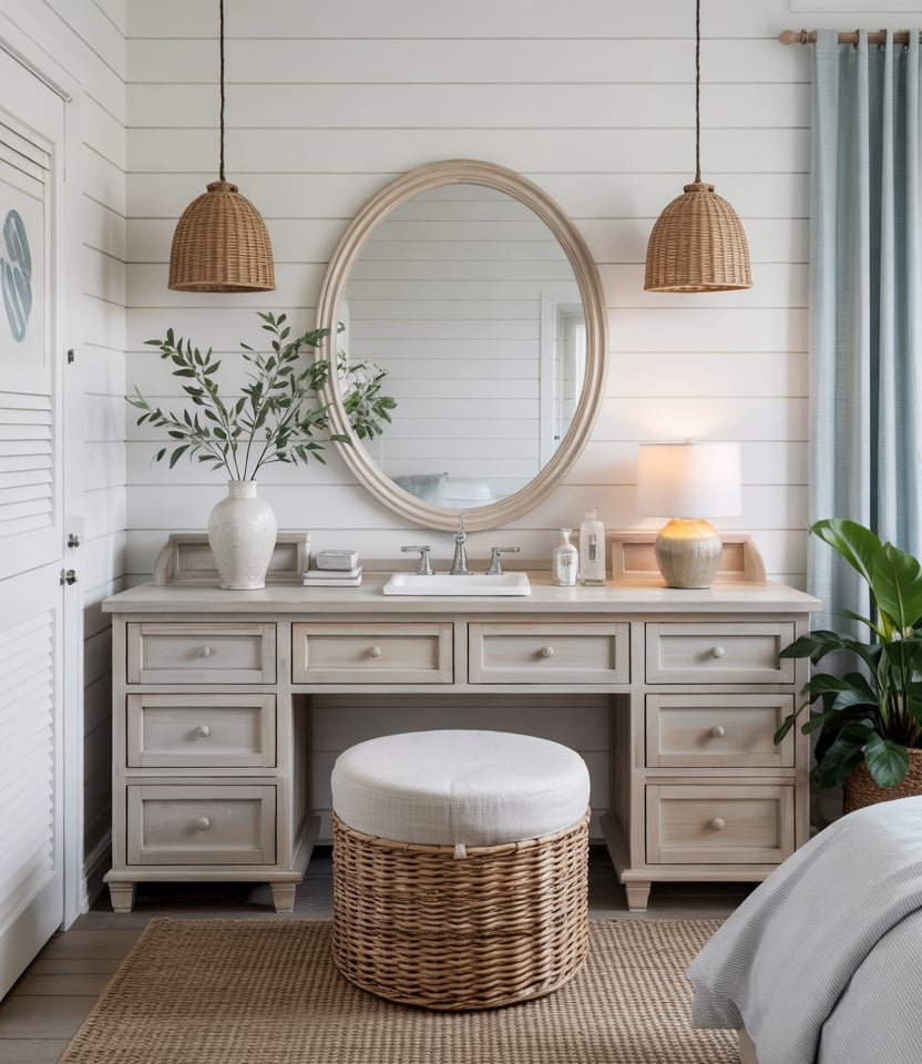 Blending soft pink touches with breezy coastal elements creates a playful yet serene vanity style. Light materials and soft colors help brighten the bedroom while still keeping a modern structure. This idea works well for homeowners who enjoy a cheerful aesthetic paired with relaxing, beach-inspired notes.